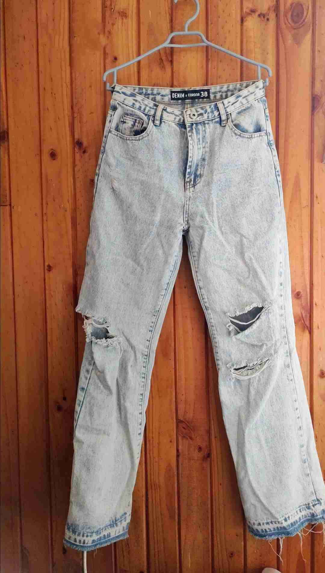 Jeans de mezclilla claros con estilo desgastado y roturas modernas. Perfecto para un look casual y relajado. Solo esta arrugado