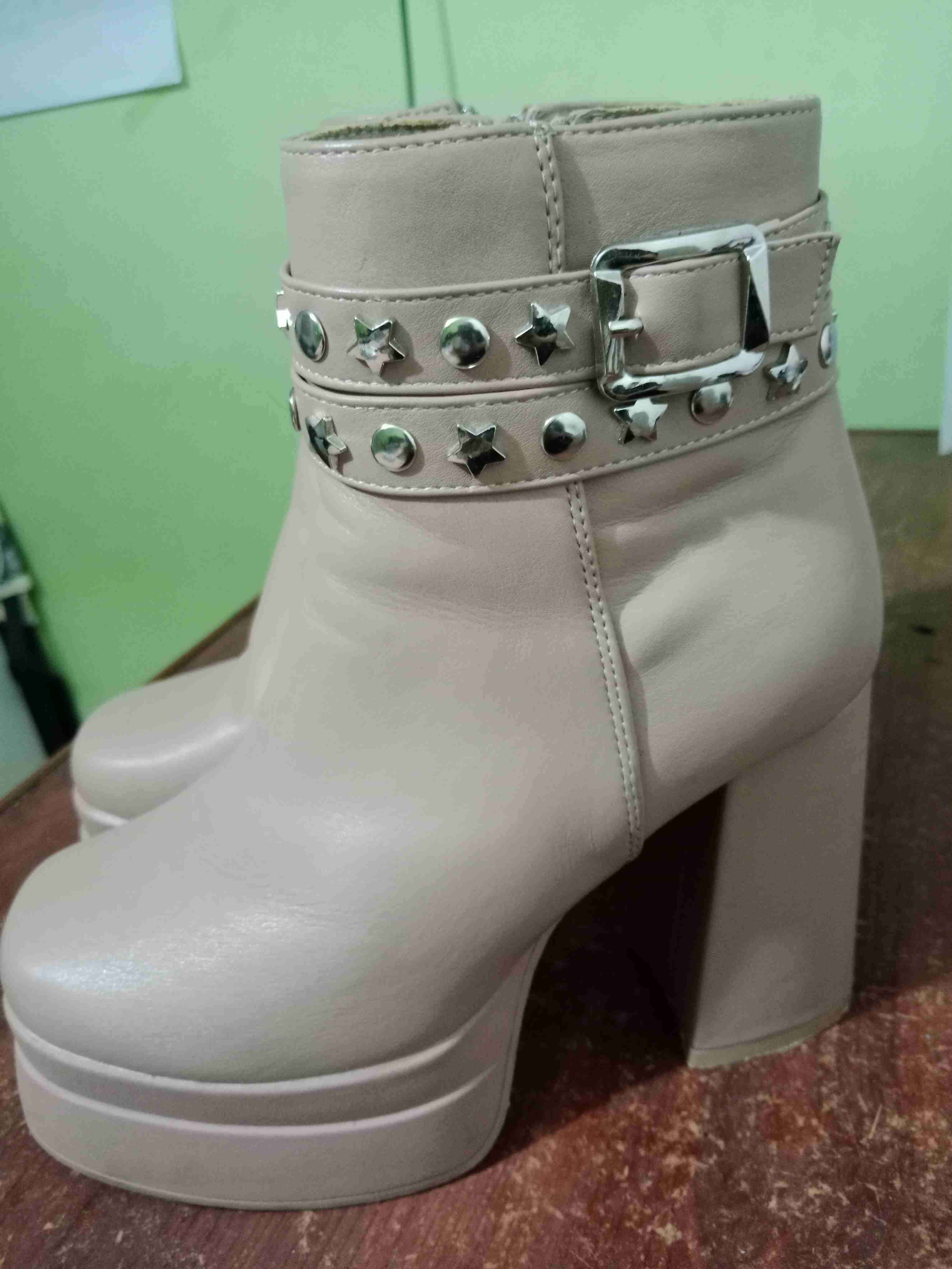Elegantes botines de color beige con plataforma y detalles de tachuelas. Perfectos para salidas o eventos formales. En buen estado general.