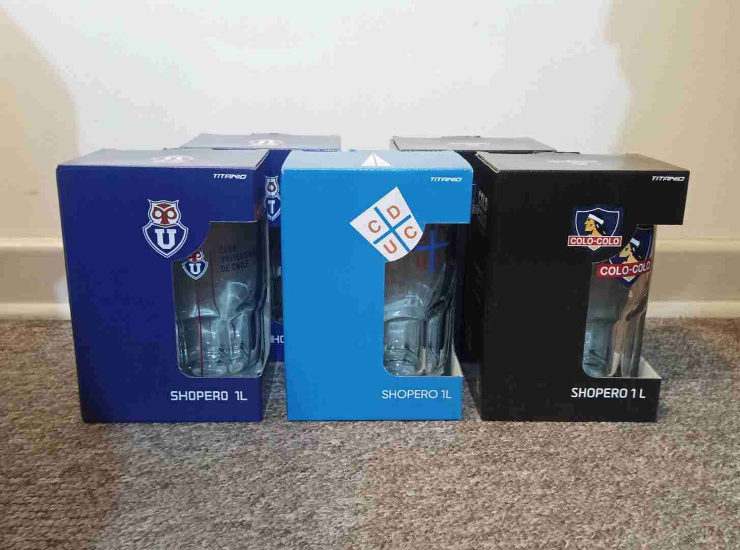 Pack de shoperos de 1L con logos de clubes chilenos. Ideal para fans de futbol ⚽
