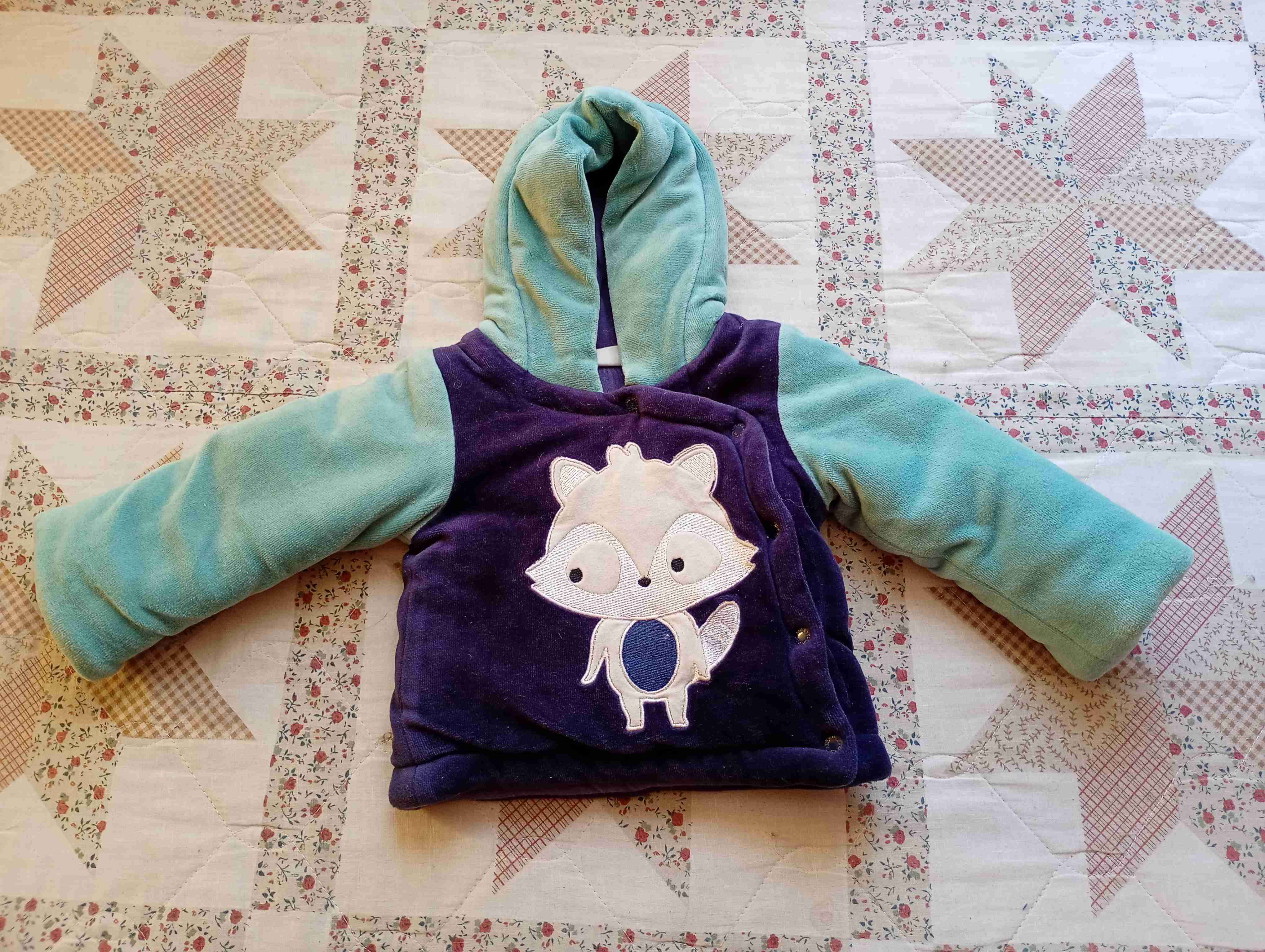 Abrigo calentito para niña o niño, en tonos verdes y morados, con capucha y divertido diseño de zorro al frente. Ideal para días fríos.