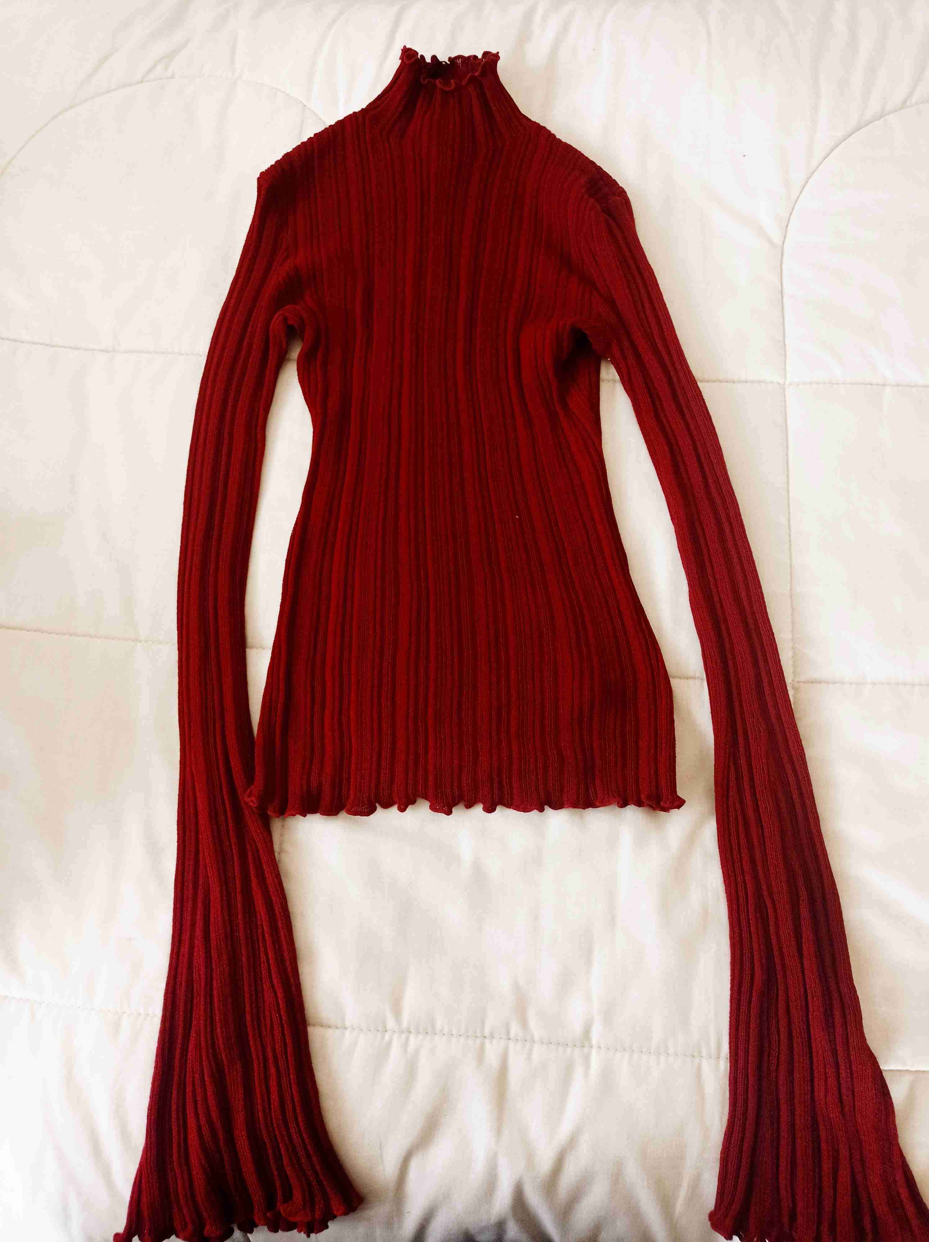 Polera de punto rojo oscuro con textura acanalada. Ideal para el invierno, en buen estado general.