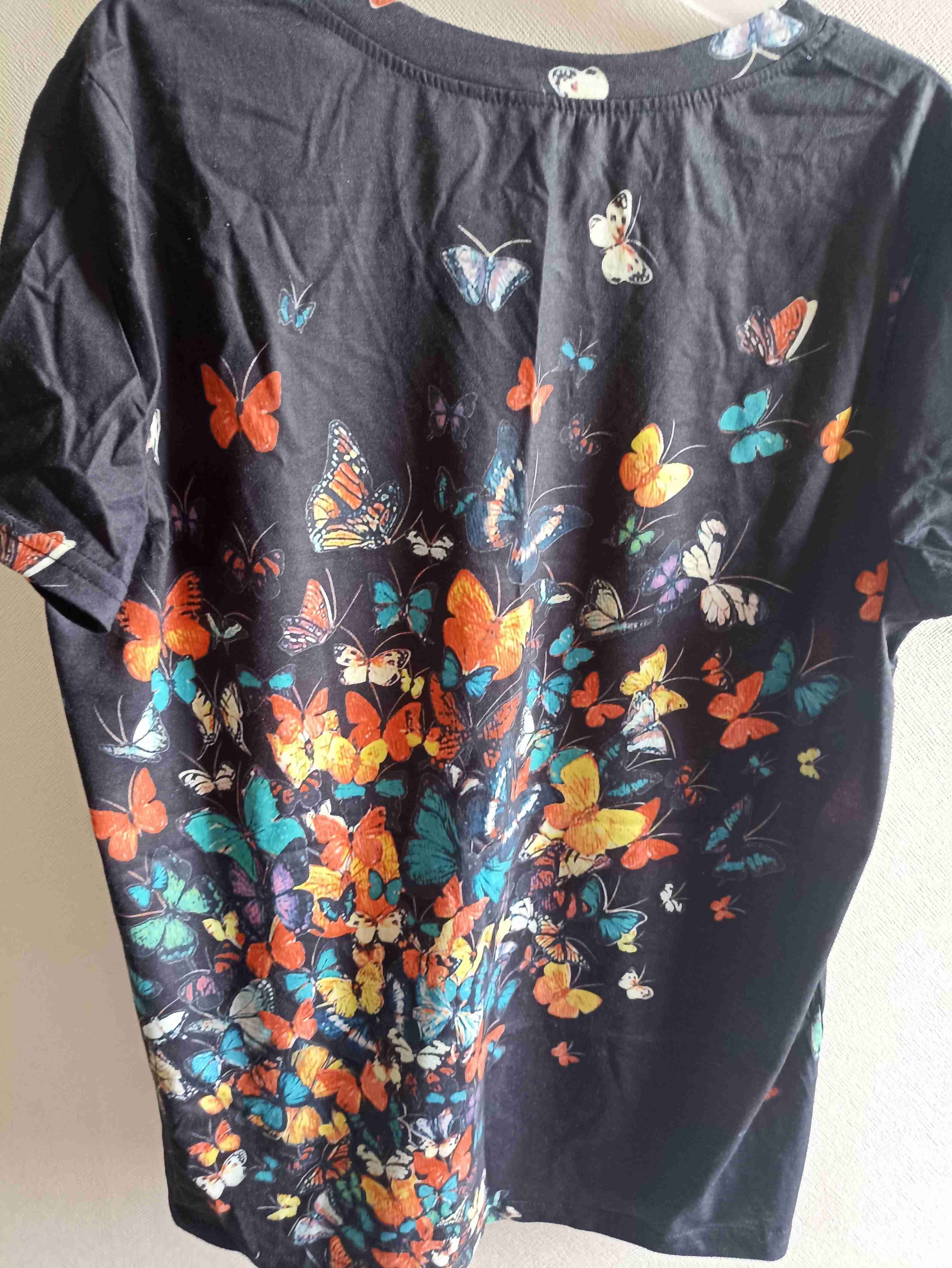 Polera negra con estampado de mariposas coloridas. Ideal para usar casualmente, buen estado.