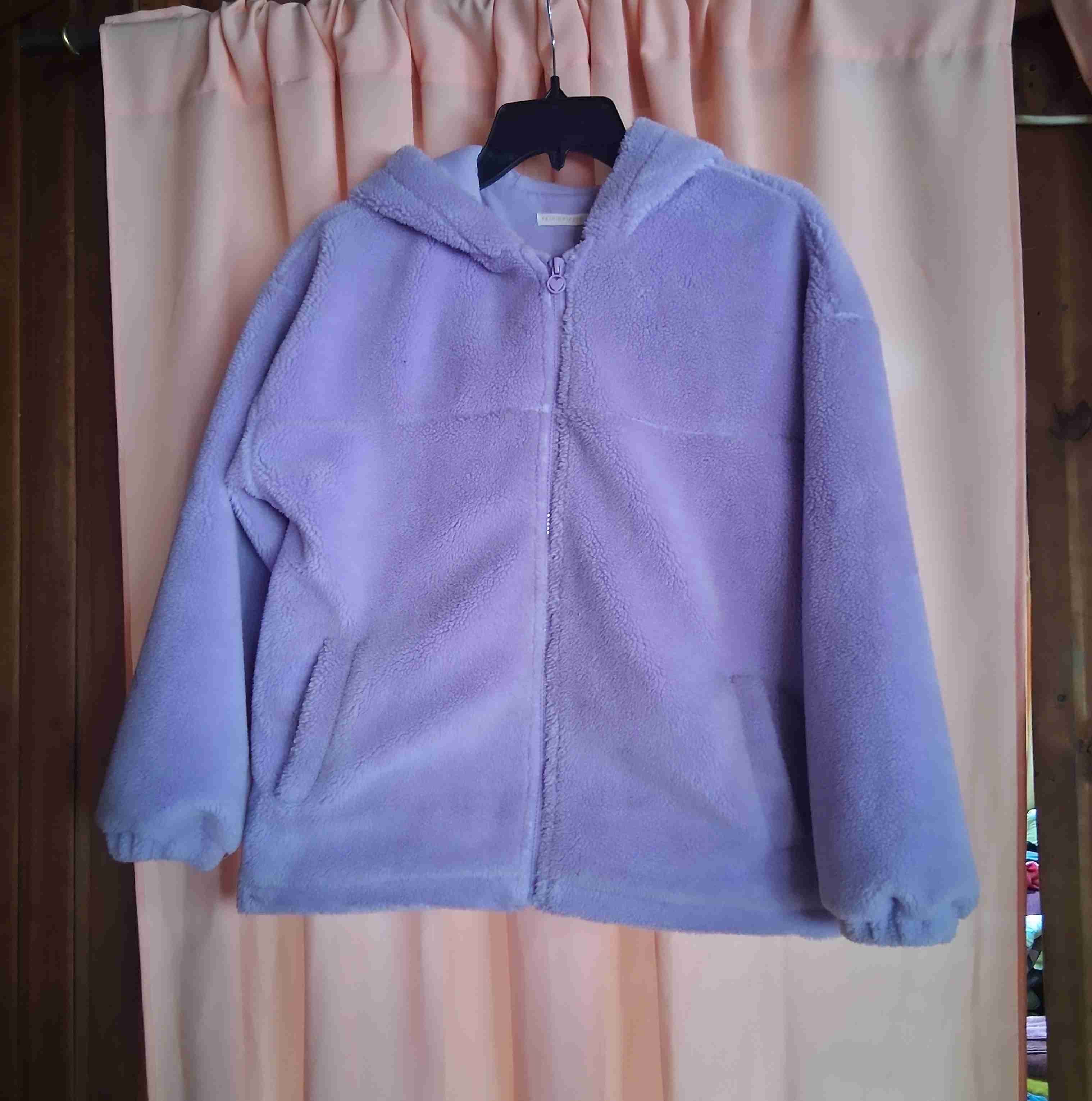 Chaqueta de polar morada con cierre, ideal para días fríos. Se ve en buen estado y es muy cómoda.