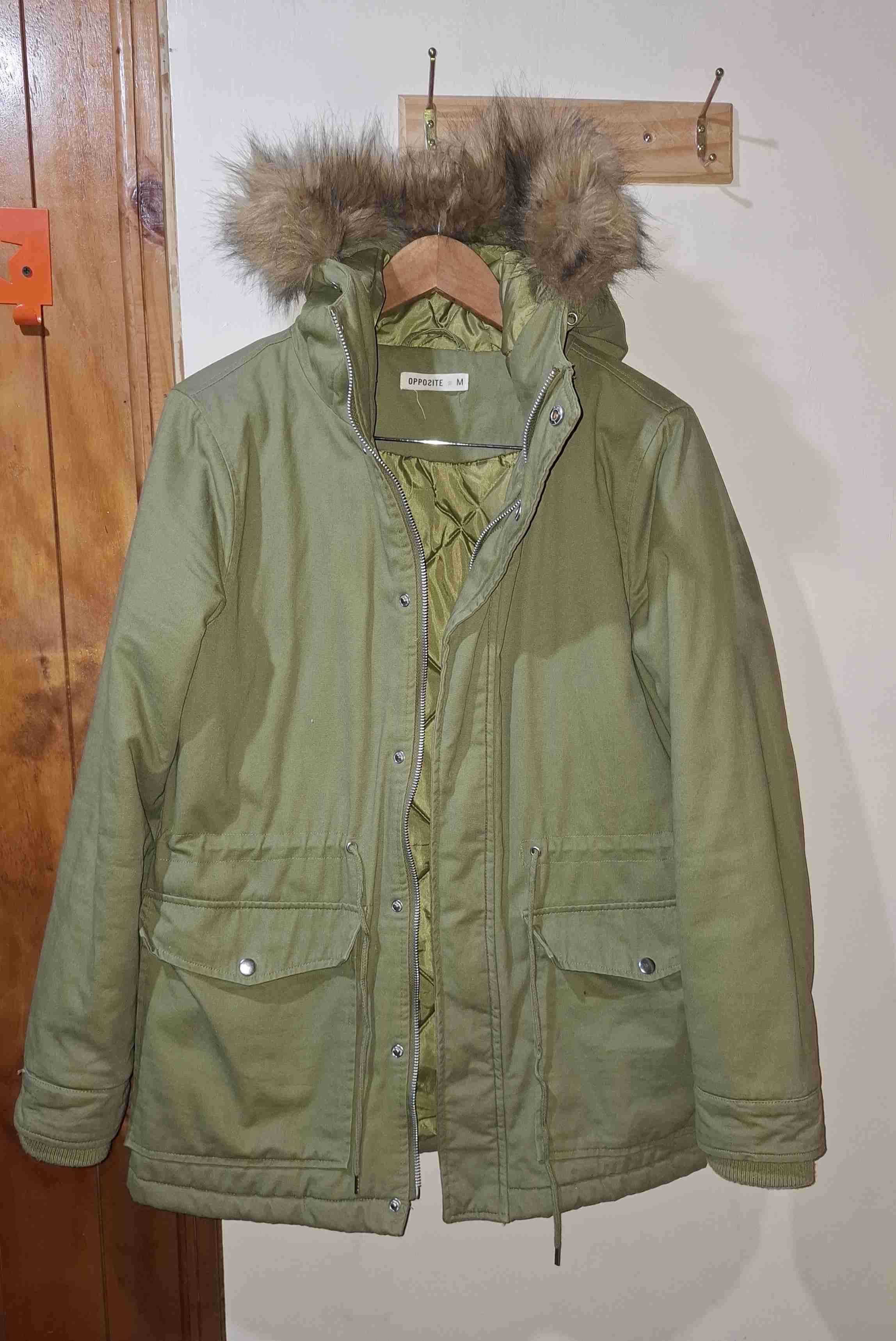 Parka verde oliva para mujer con capucha y forro de peluche. Ideal para el invierno y en buen estado.