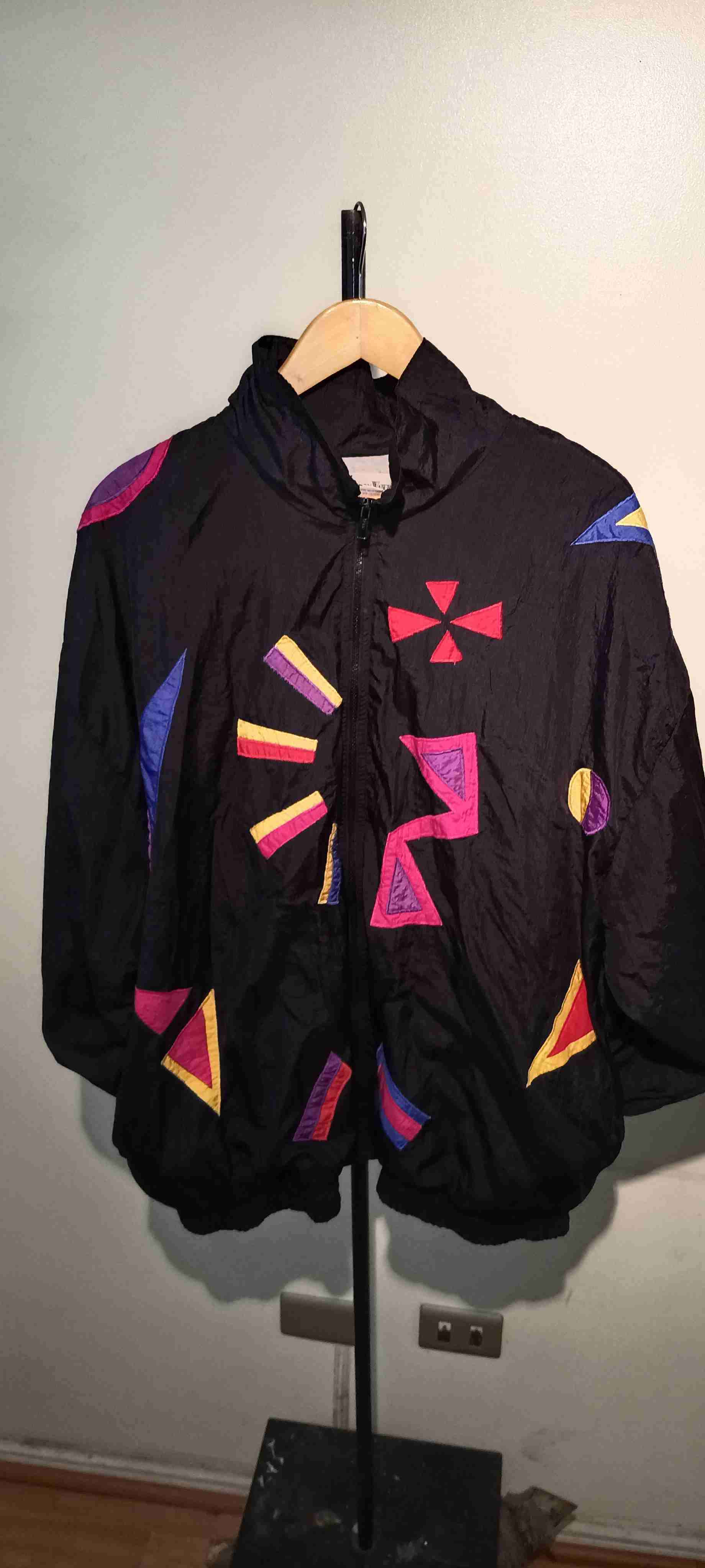 Chaqueta negra con estampados coloridos, estilo retro. Buen estado, perfecta para un look casual único.