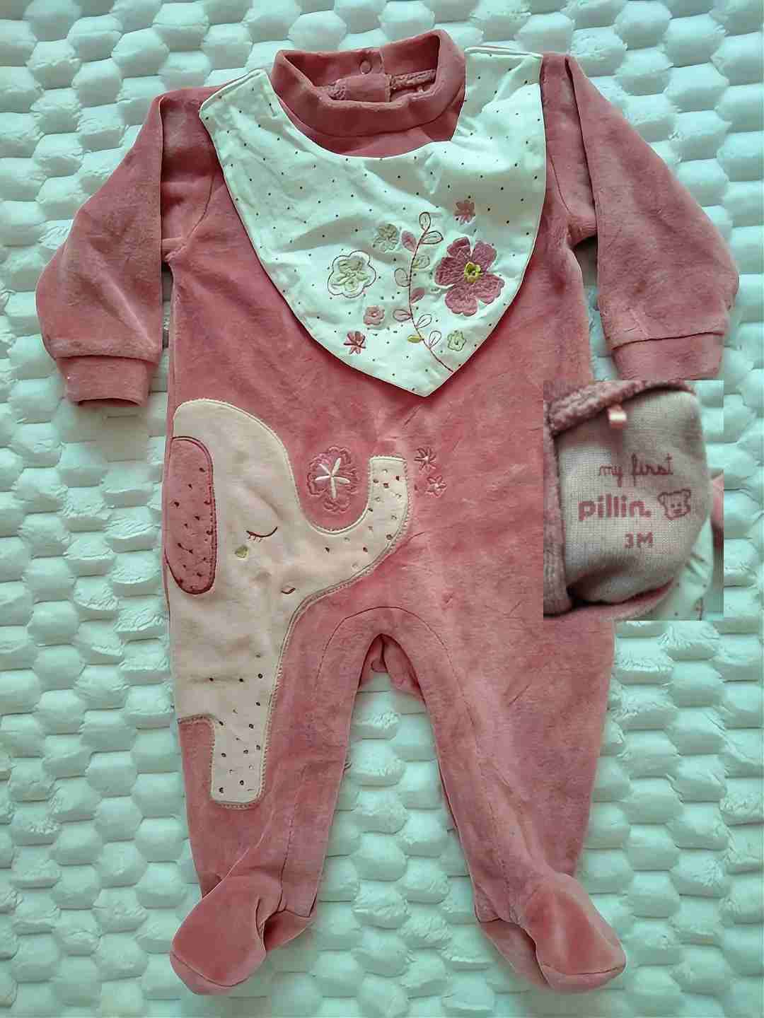 Pijama de bebé rosado con diseño de elefante y babero a juego, ideal para recién nacidos. Buen estado, suave y cómodo para el uso diario.