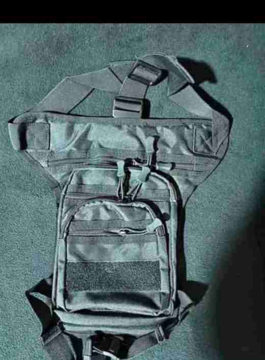 Riñonera táctica de color negro, ideal para actividades al aire libre. En buen estado, con varios compartimentos.