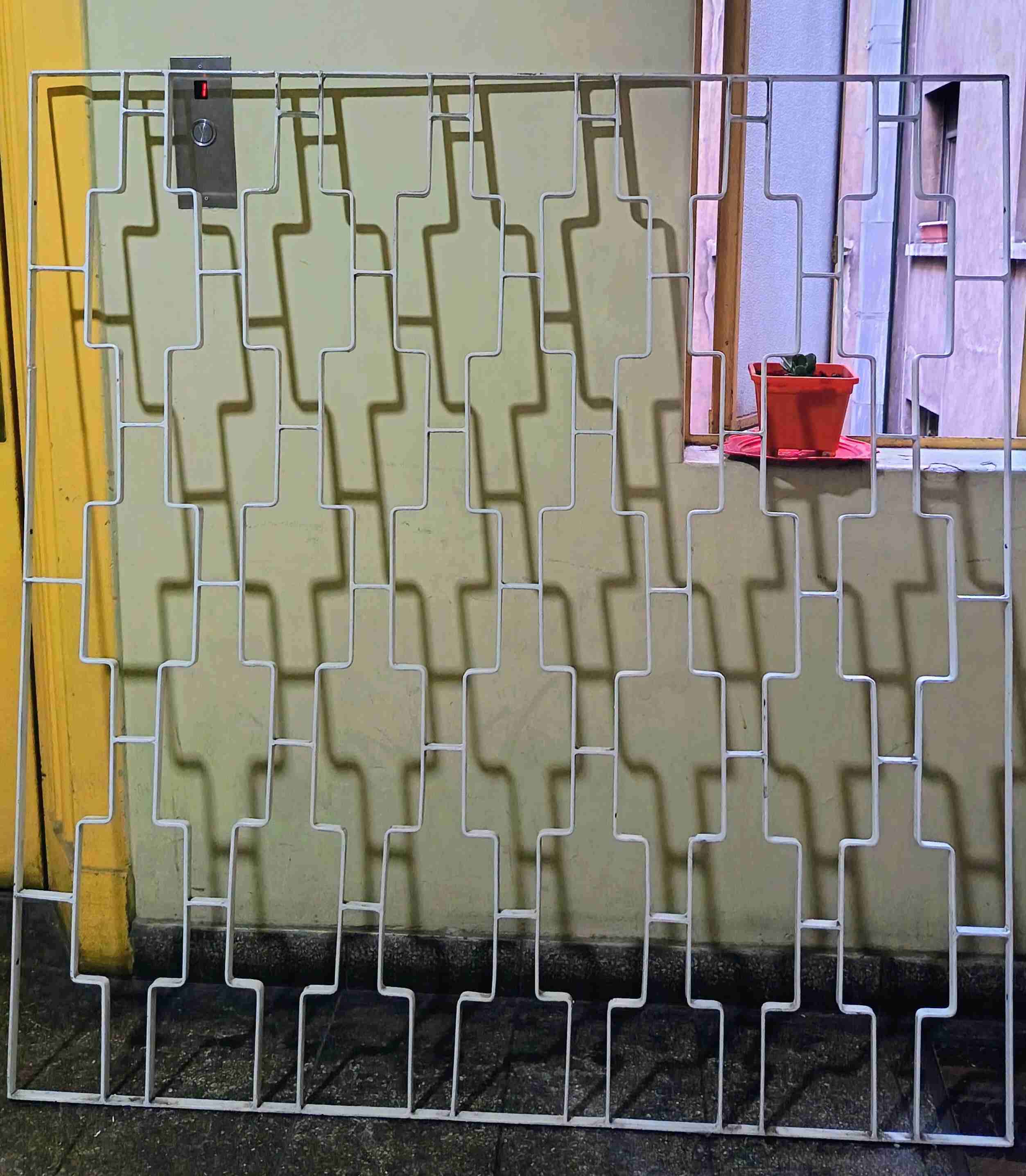 Reja metálica blanca con diseño geométrico. Ideal para ventanas o divisiones. En buen estado.Medidas 140 X 155 se entrega en paseo Bulnes 123 serca a estación moneda