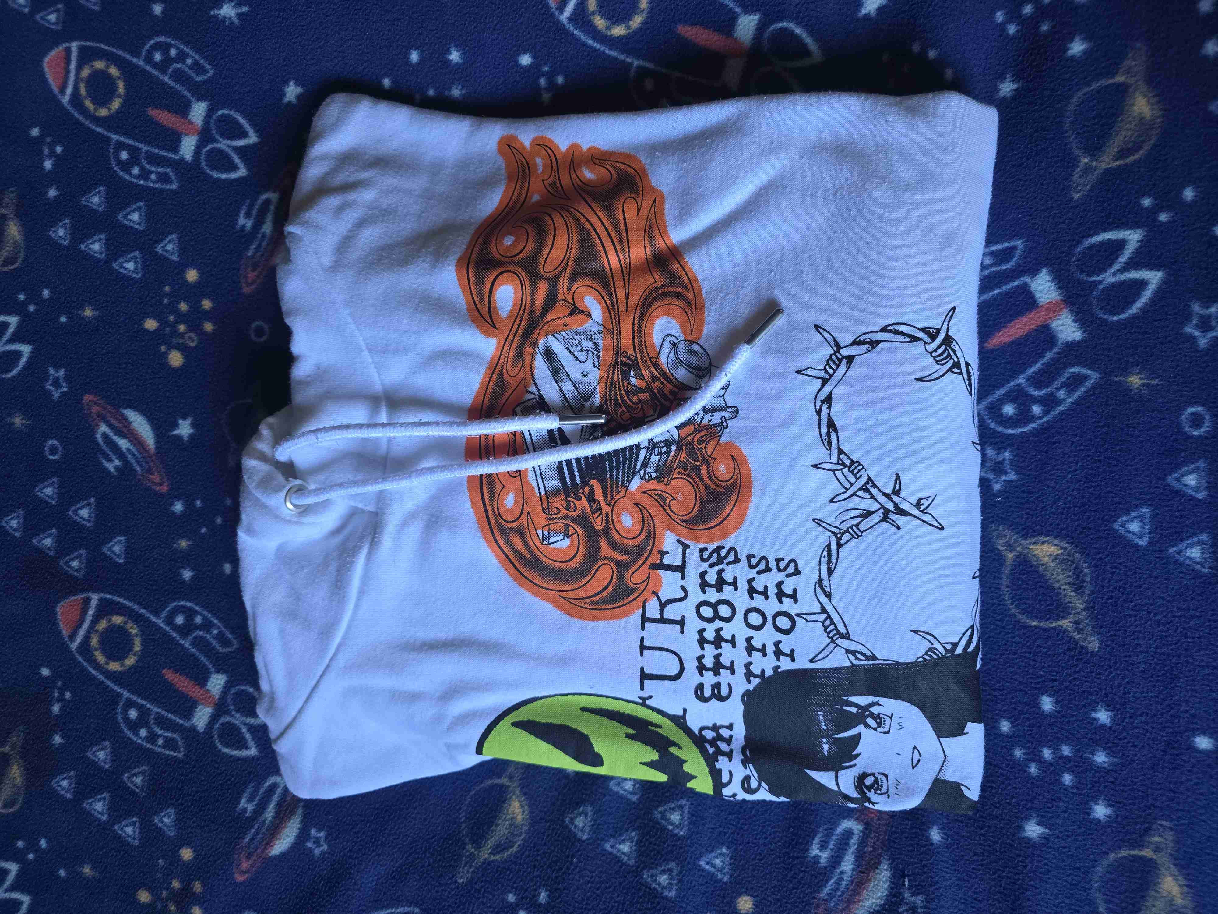 Polerón blanco con capucha y estampados gráficos coloridos. En buen estado, ideal para uso casual.
