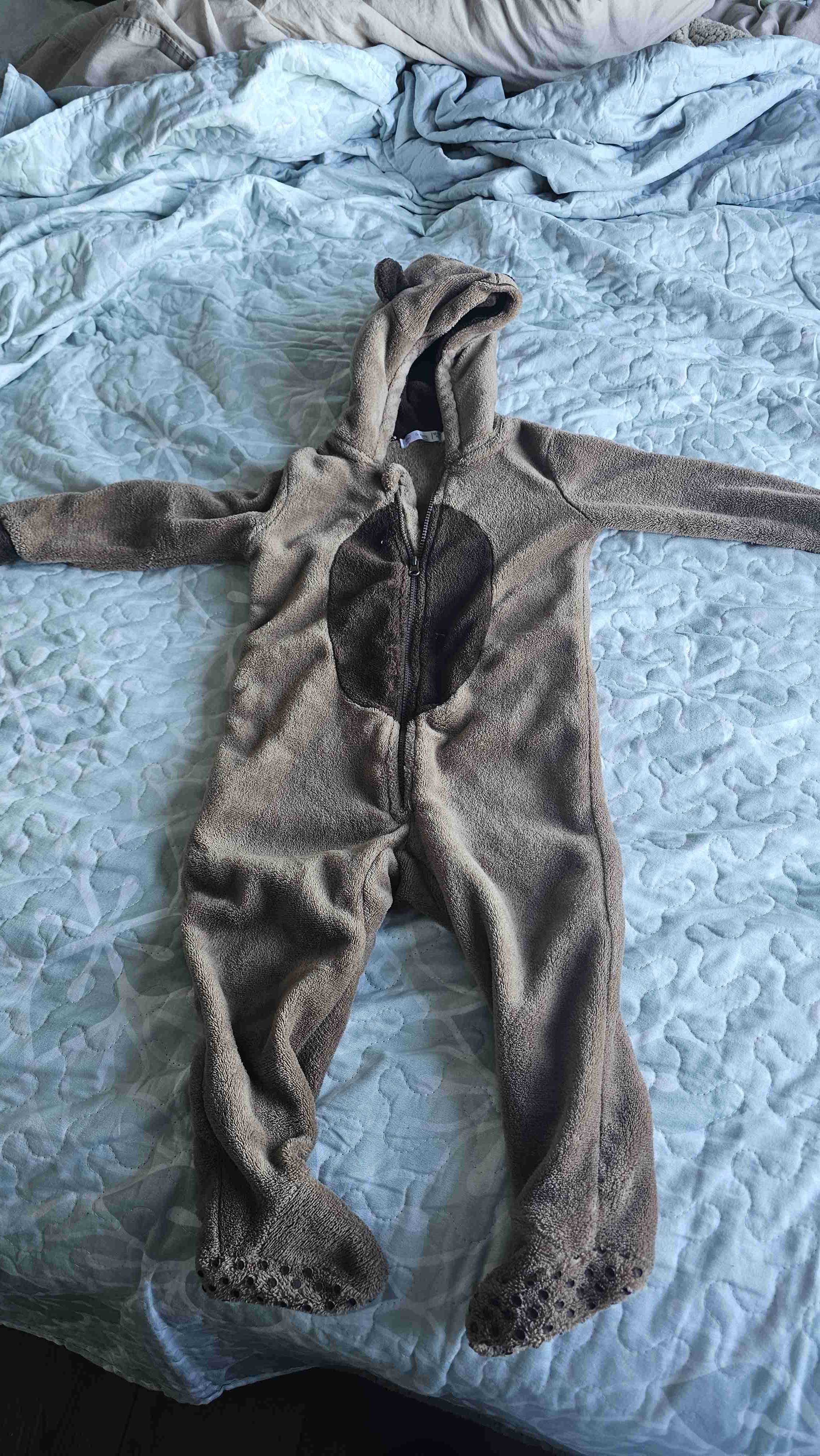 Lindo disfraz de oso para niño, con capucha y orejas. Perfecto para ocasiones especiales o disfraces. En buen estado general, usado levemente.