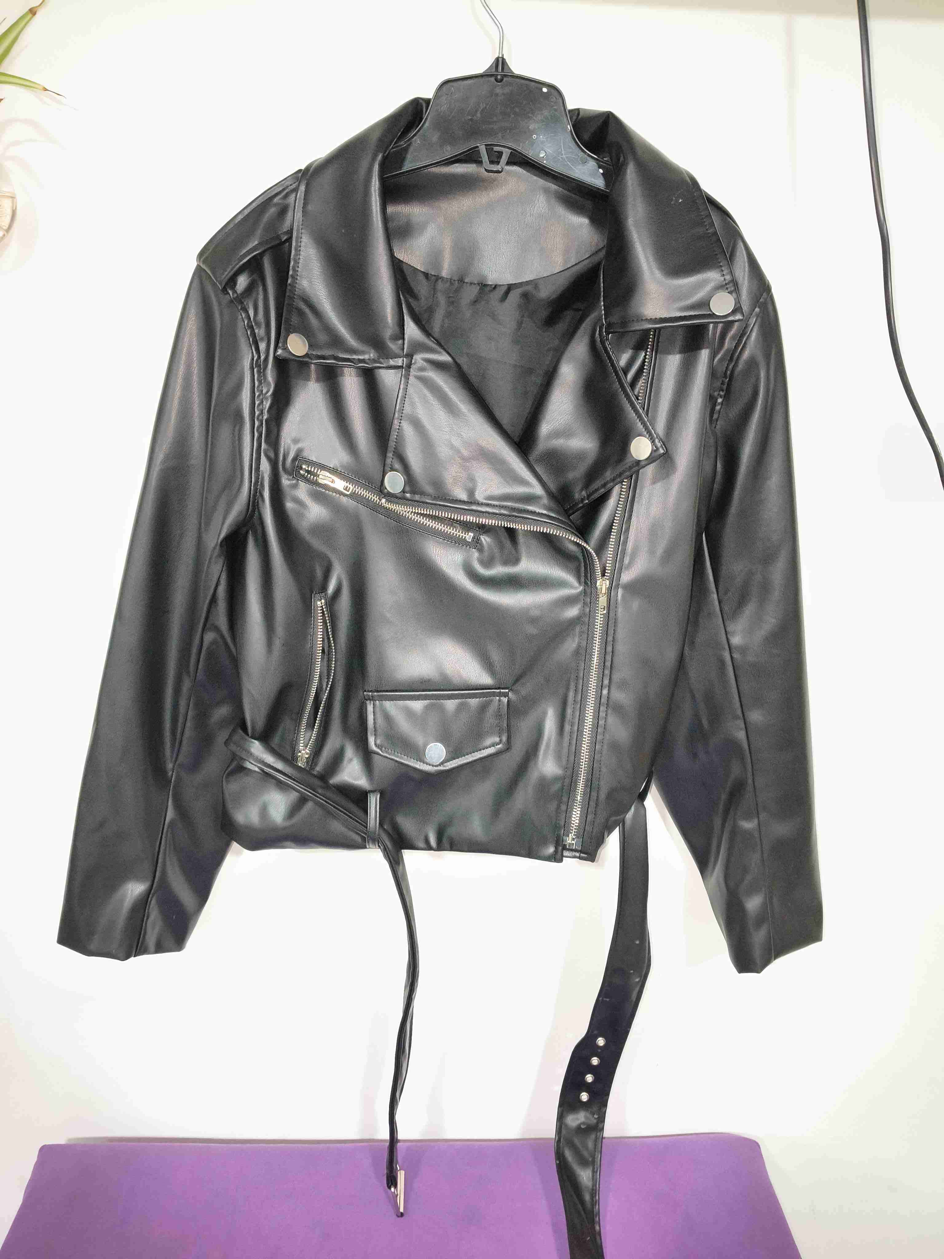 Elegante chaqueta negra de cuero sintético para un look moderno. En buen estado, ideal para salir de noche.