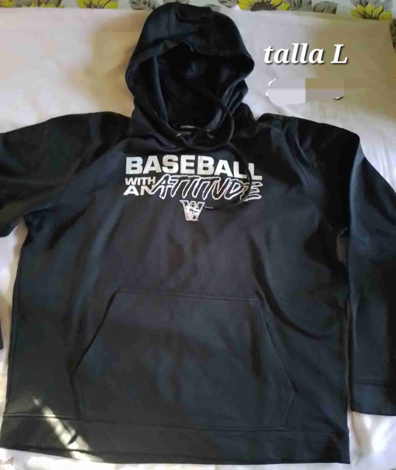 Polerón con capucha negro, estampado con texto 'BASEBALL WITH AN ATTITUDE'. En buen estado, ideal para ocasiones casuales.