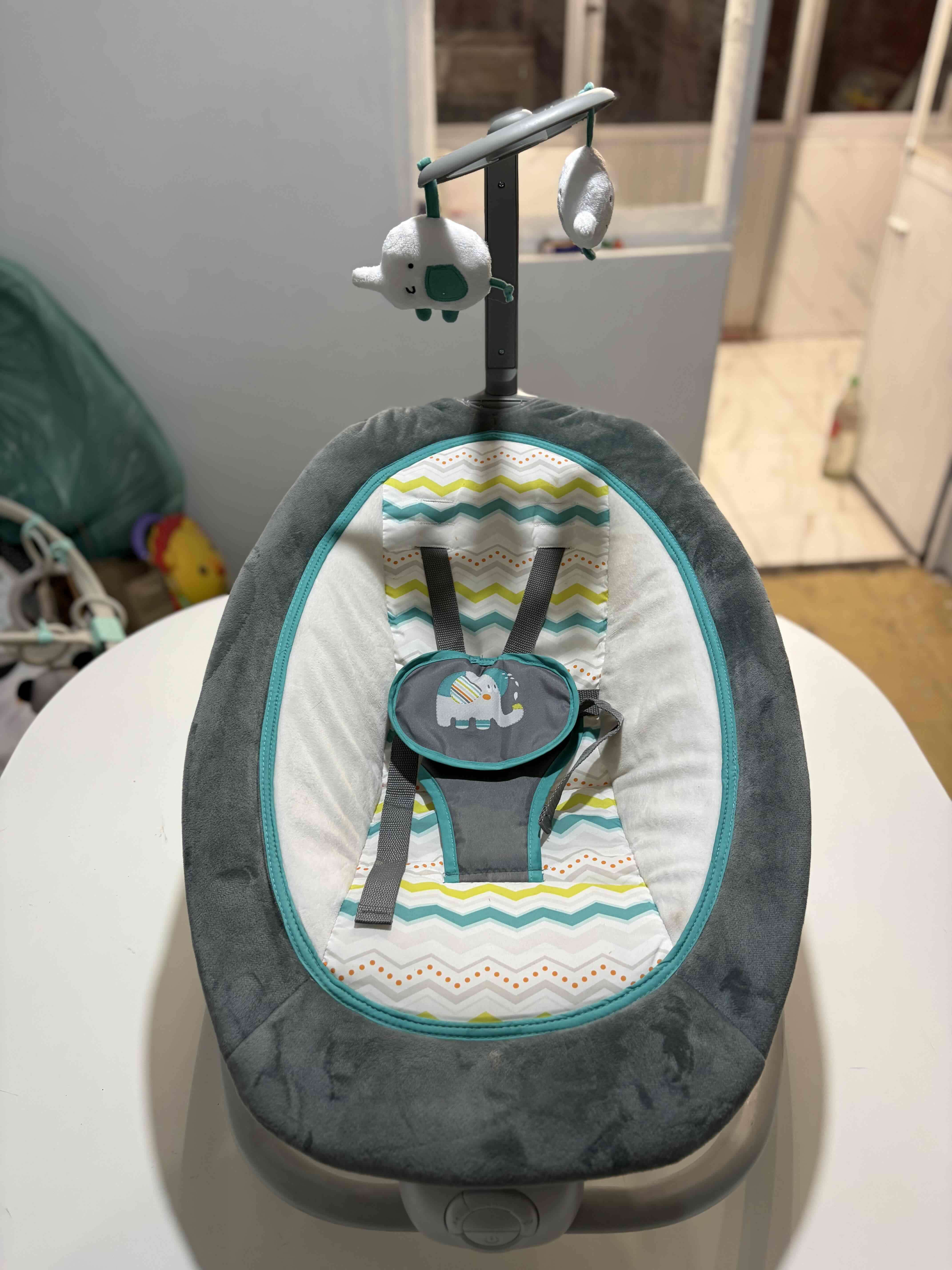 Silla mecedora en buen estado con diseño de elefante y colores vibrantes. Ideal para mantener al bebé cómodo y entretenido. Tiene música y vibra