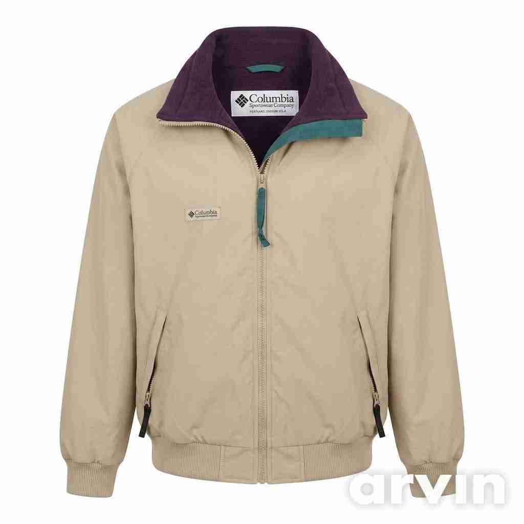 Chaqueta Columbia en color beige con forro morado, ideal para días fríos. Estado bueno, con mínimos signos de uso.