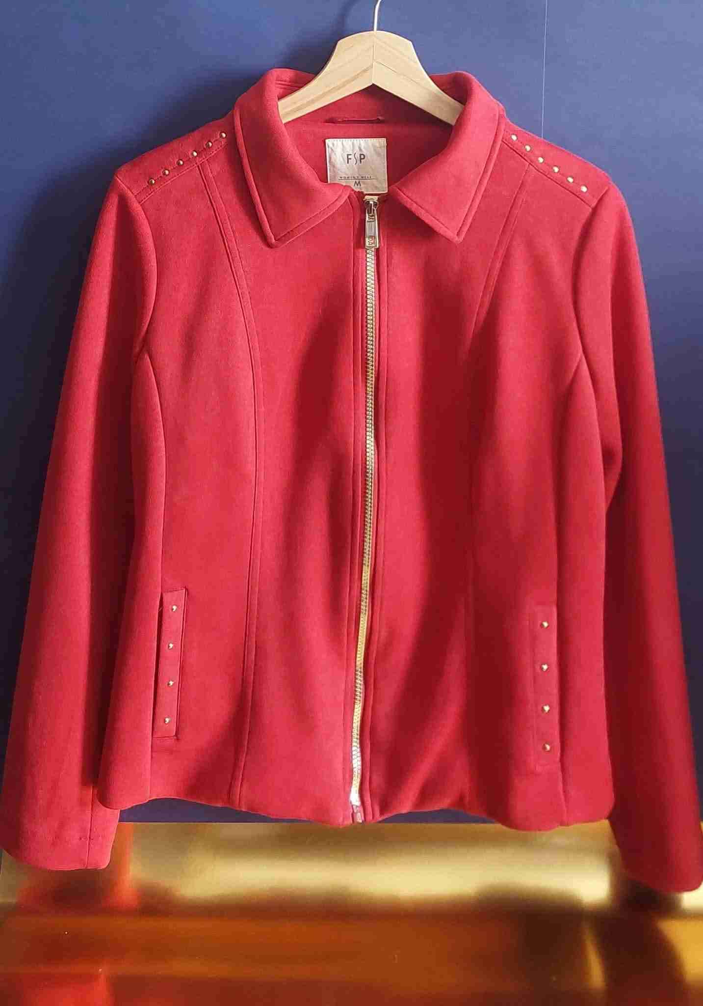 Elegante chaqueta roja con tachas decorativas y cierre frontal. En buen estado, ideal para el otoño. Talla M