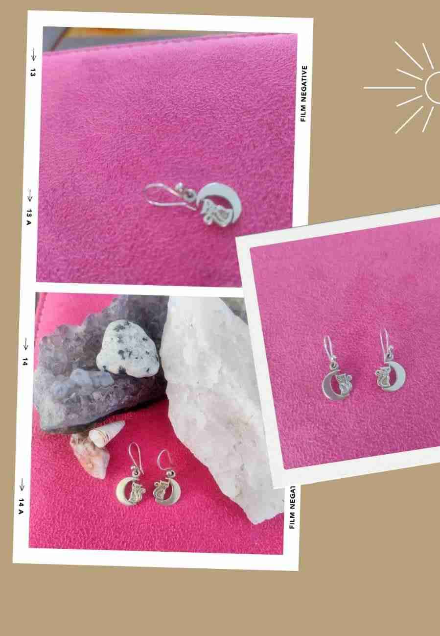 Elegantes aros de plata con diseño de luna y gatito. En buen estado, ideal para usar a diario o en ocasiones especiales.