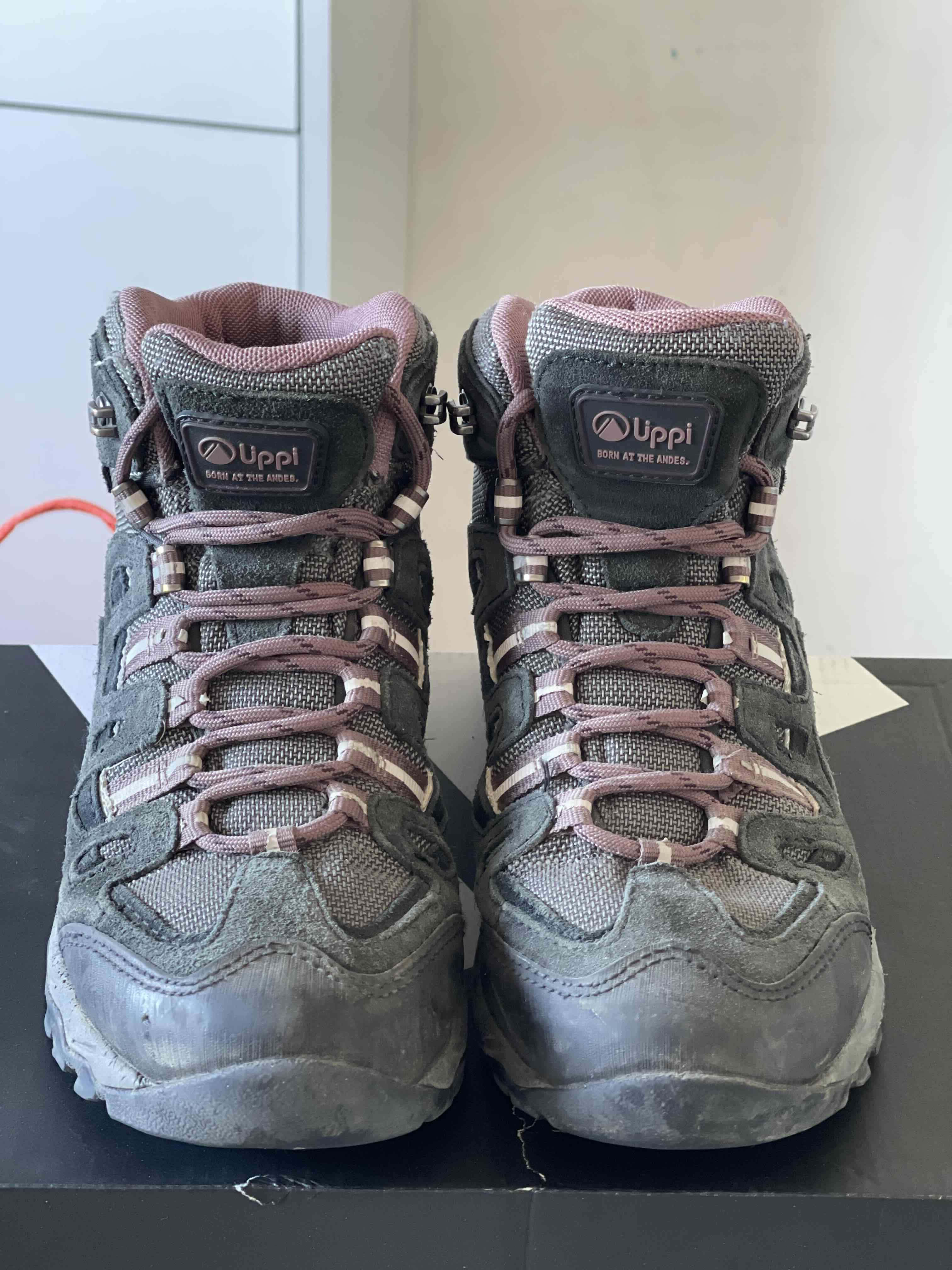 Botas para trekking color gris con detalles rosados. En buen estado, perfectas para caminatas largas en terrenos exigentes. Talla 35