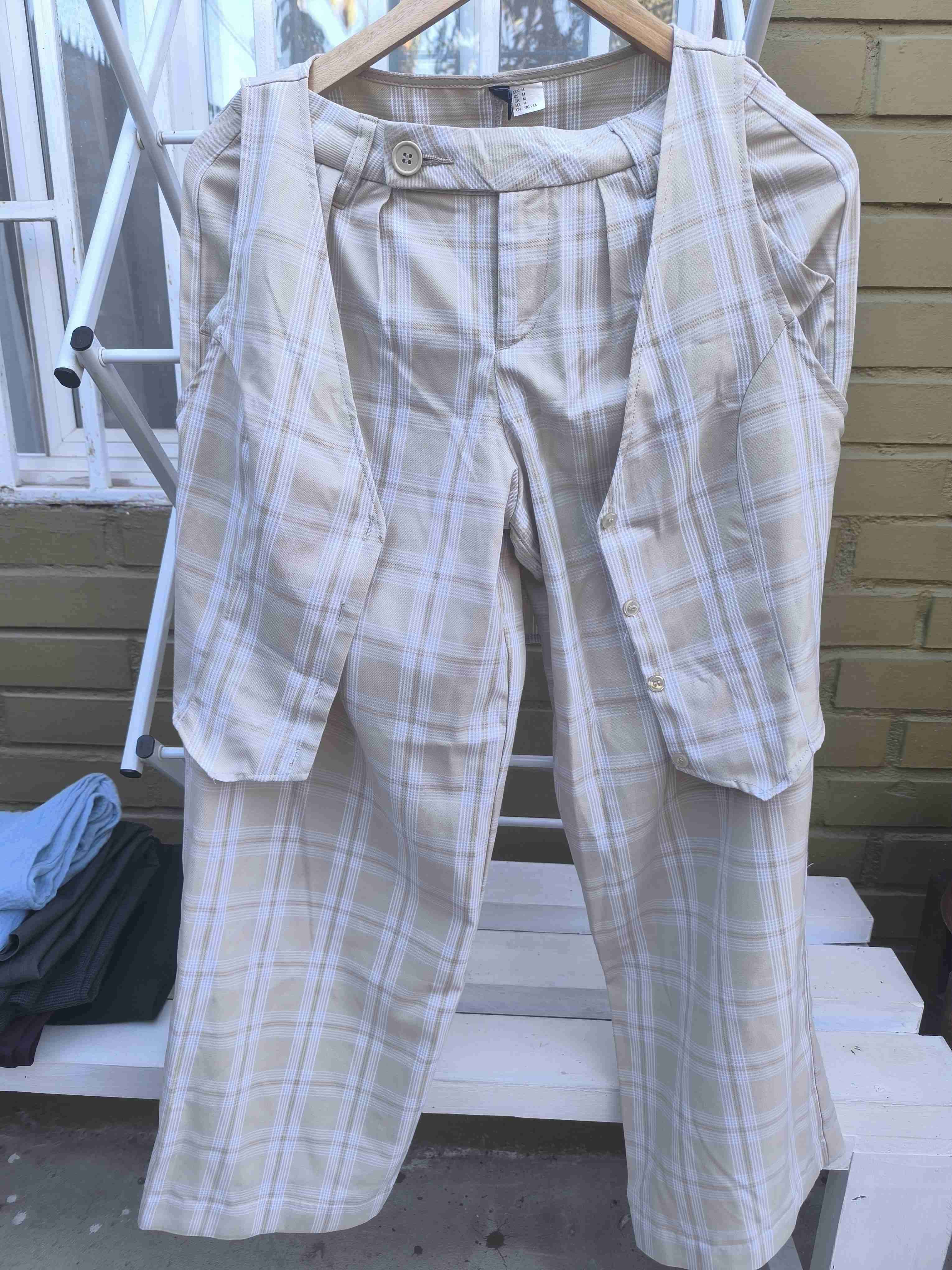 Conjunto elegante con pantalón de cuadros beige, ideal para un look casual. Bien cuidado y en buen estado. El pantalón es talla 36 y el chaleco es talla m