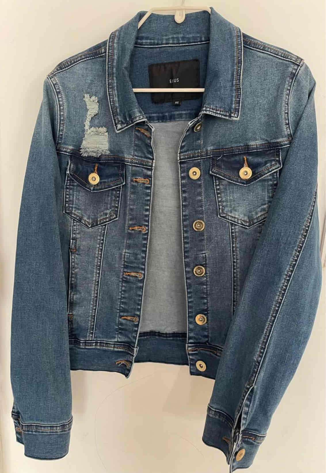Chaqueta de mezclilla azul con diseño desgastado. Nueva, sin uso sin etiqueta, ideal para estilo casual.