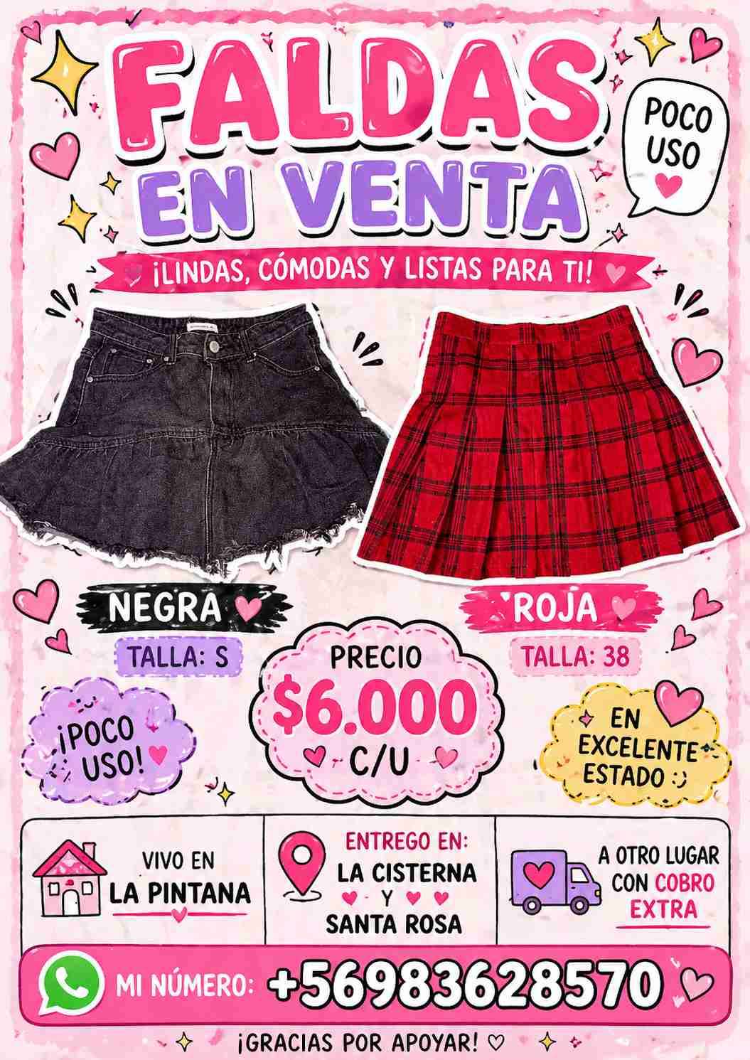 Faldas lindas, poco uso, perfectas para cualquier ocasión. Falda negra talla S, roja talla 38. En excelente estado.