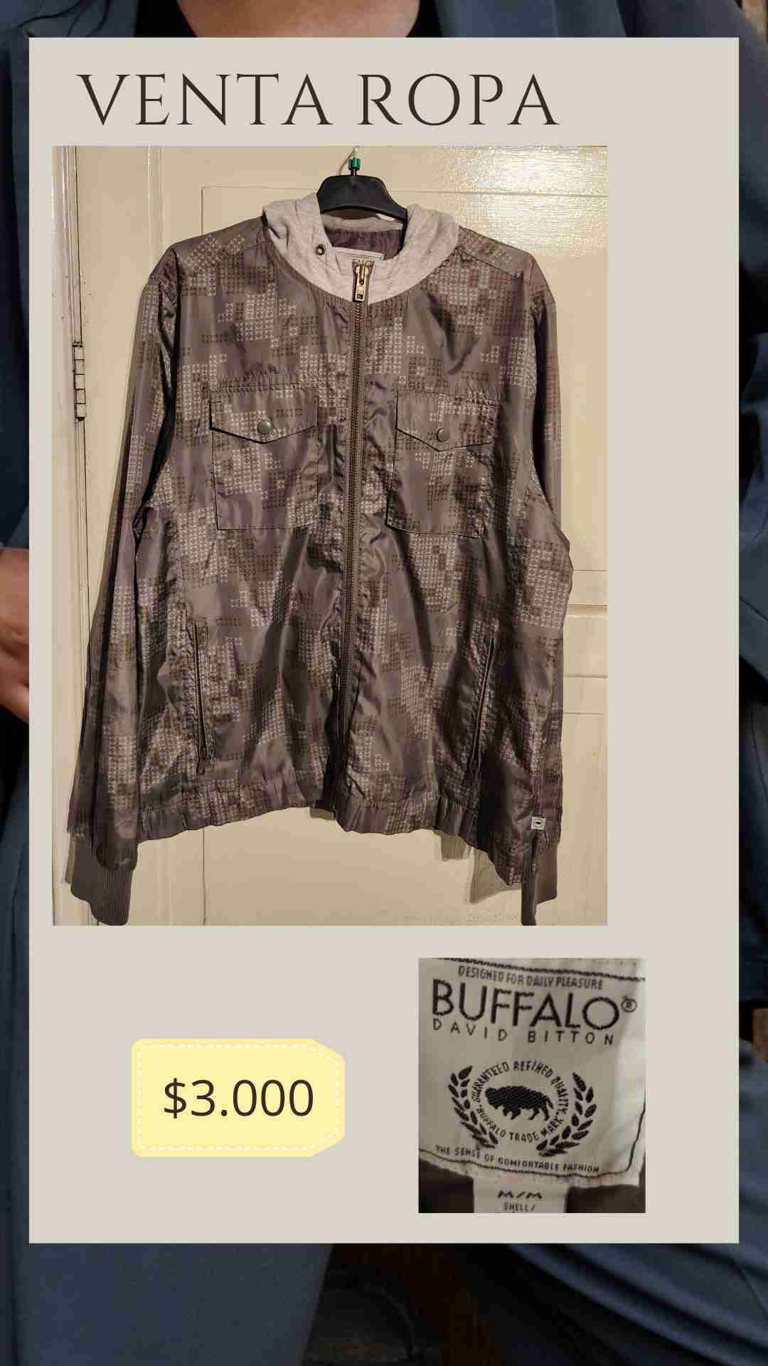Chaqueta con capucha y diseño estampado. Buen estado, ideal para clima fresco.