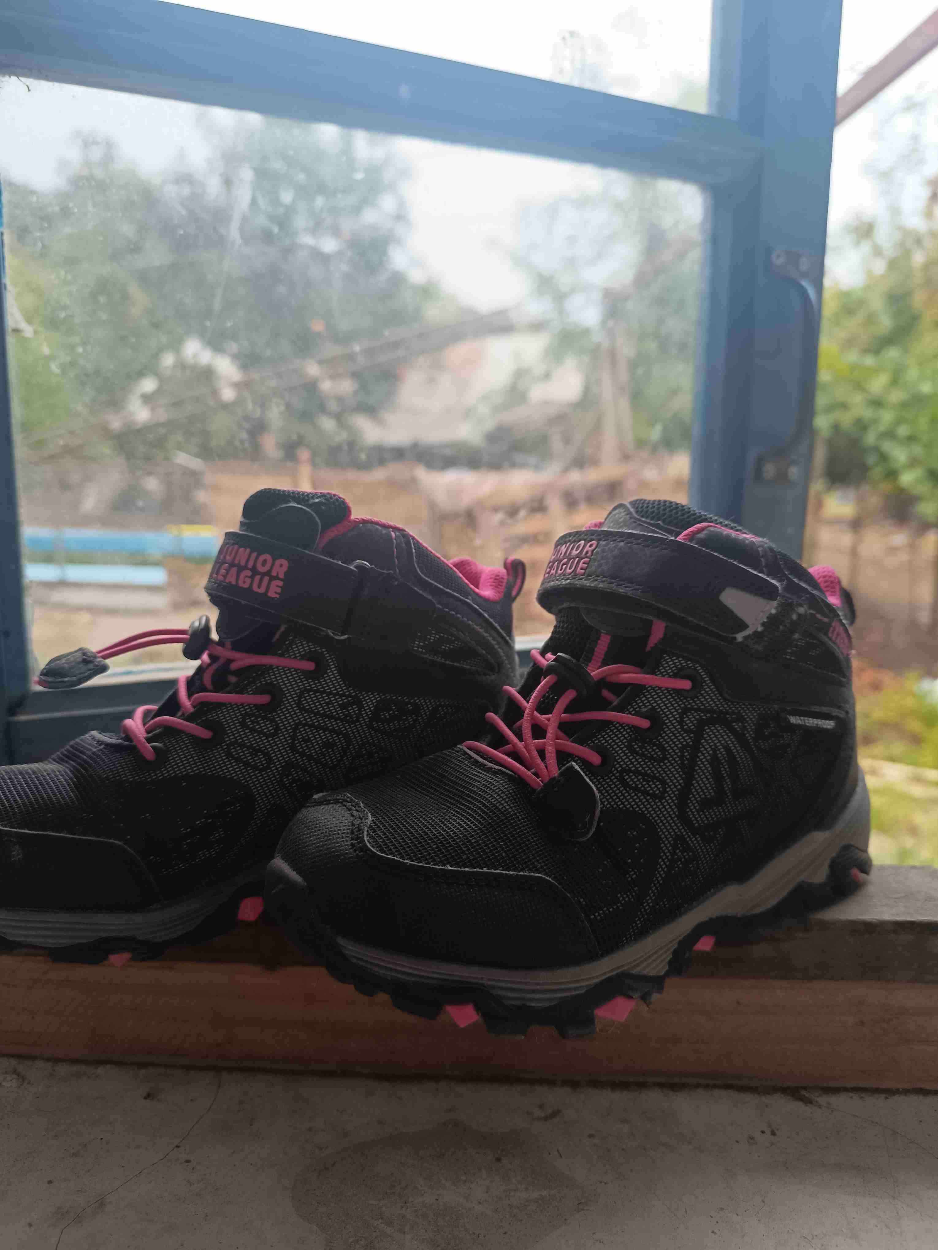 Zapatillas deportivas negras con detalles rosados, perfectas para actividades al aire libre. En buen estado.