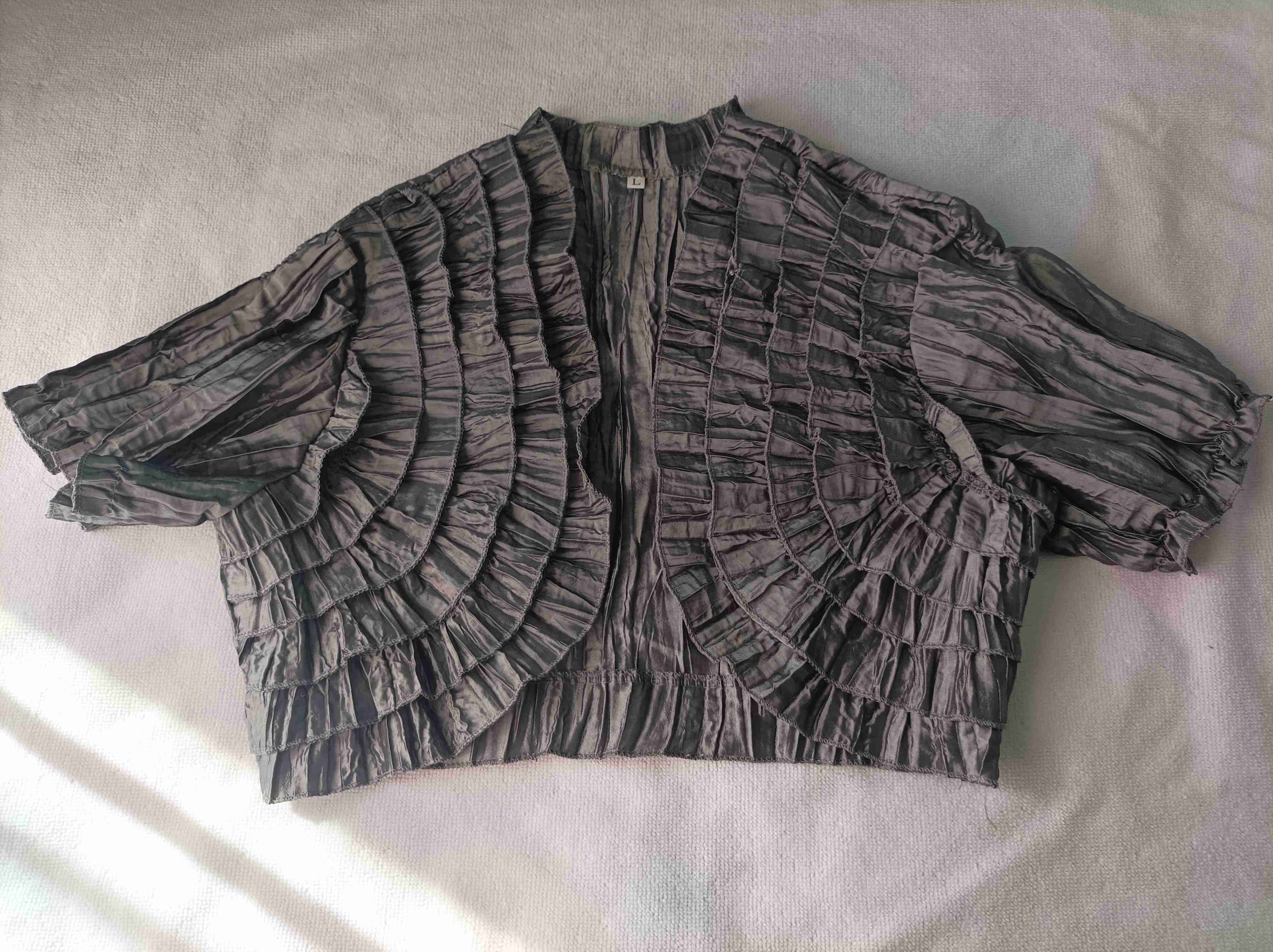 Chaqueta gris con detalles plisados, ideal para ocasiones especiales. En buen estado, apenas usada.