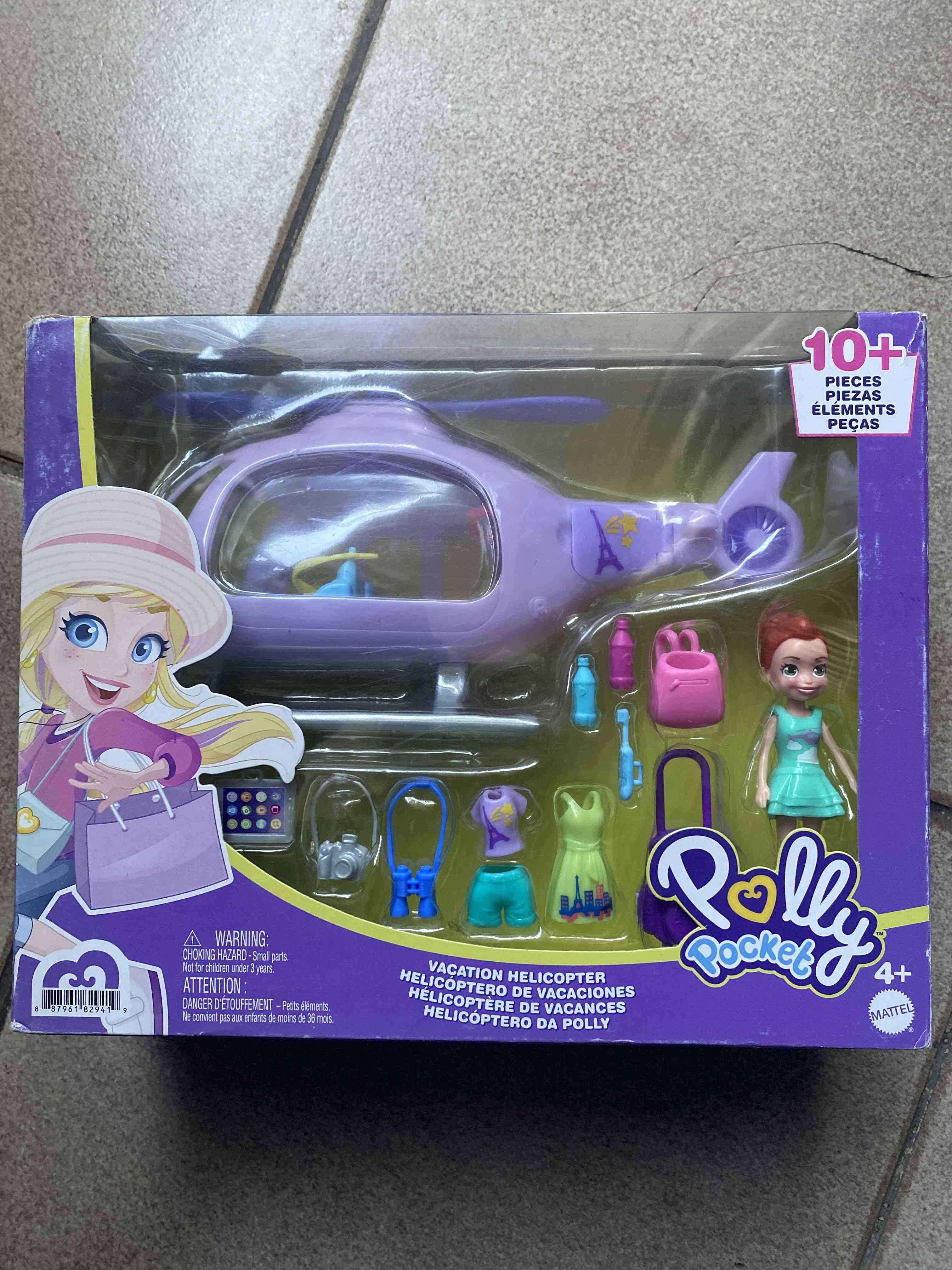 Set de juego Polly Pocket con helicóptero y accesorios. Ideal para aventuras y juegos imaginativos. Estado nuevo en caja original.