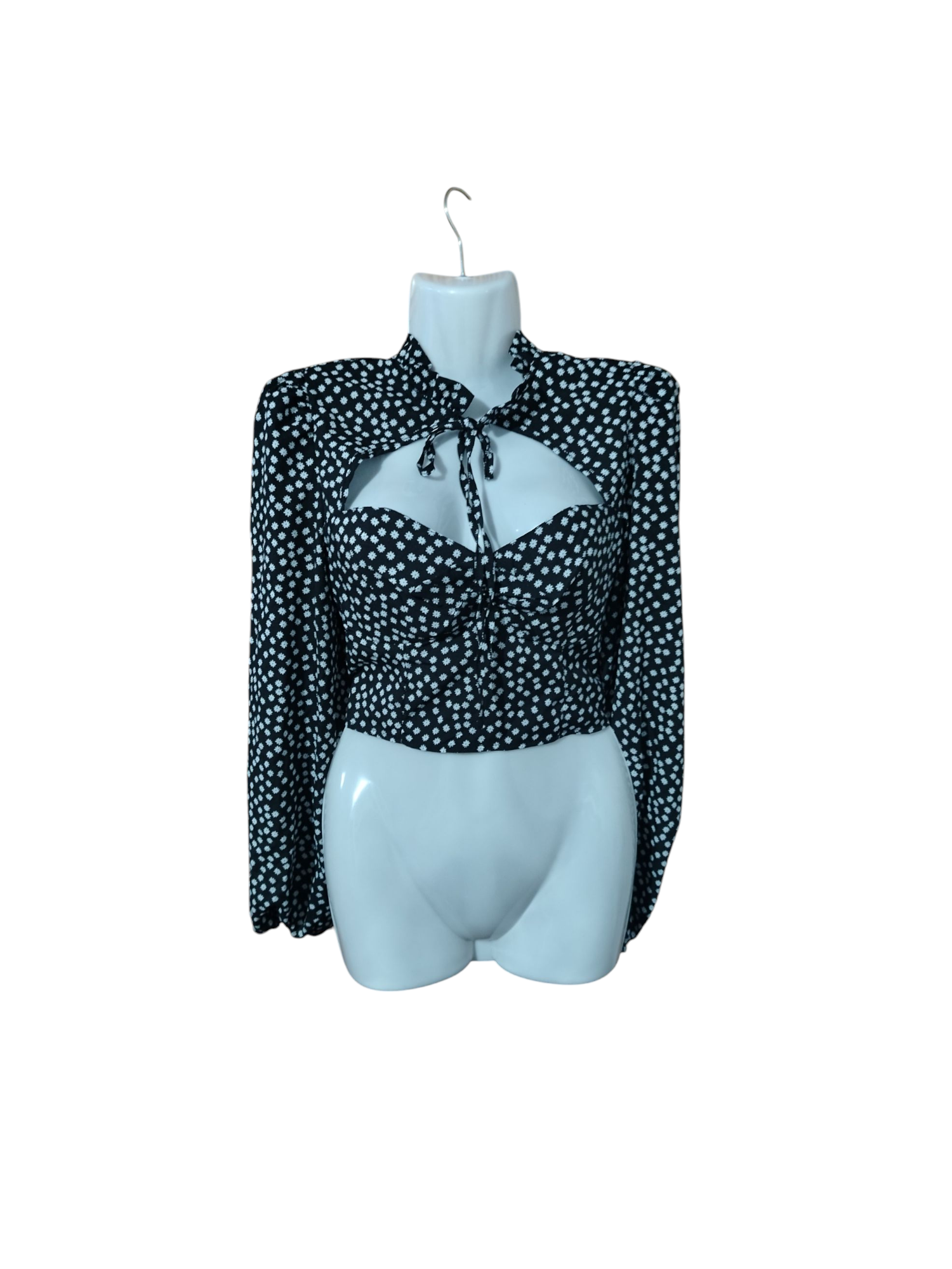 Elegante blusa negra con lunares blancos y detalle en el escote. Ideal para salidas casuales o formales. Talla M-L