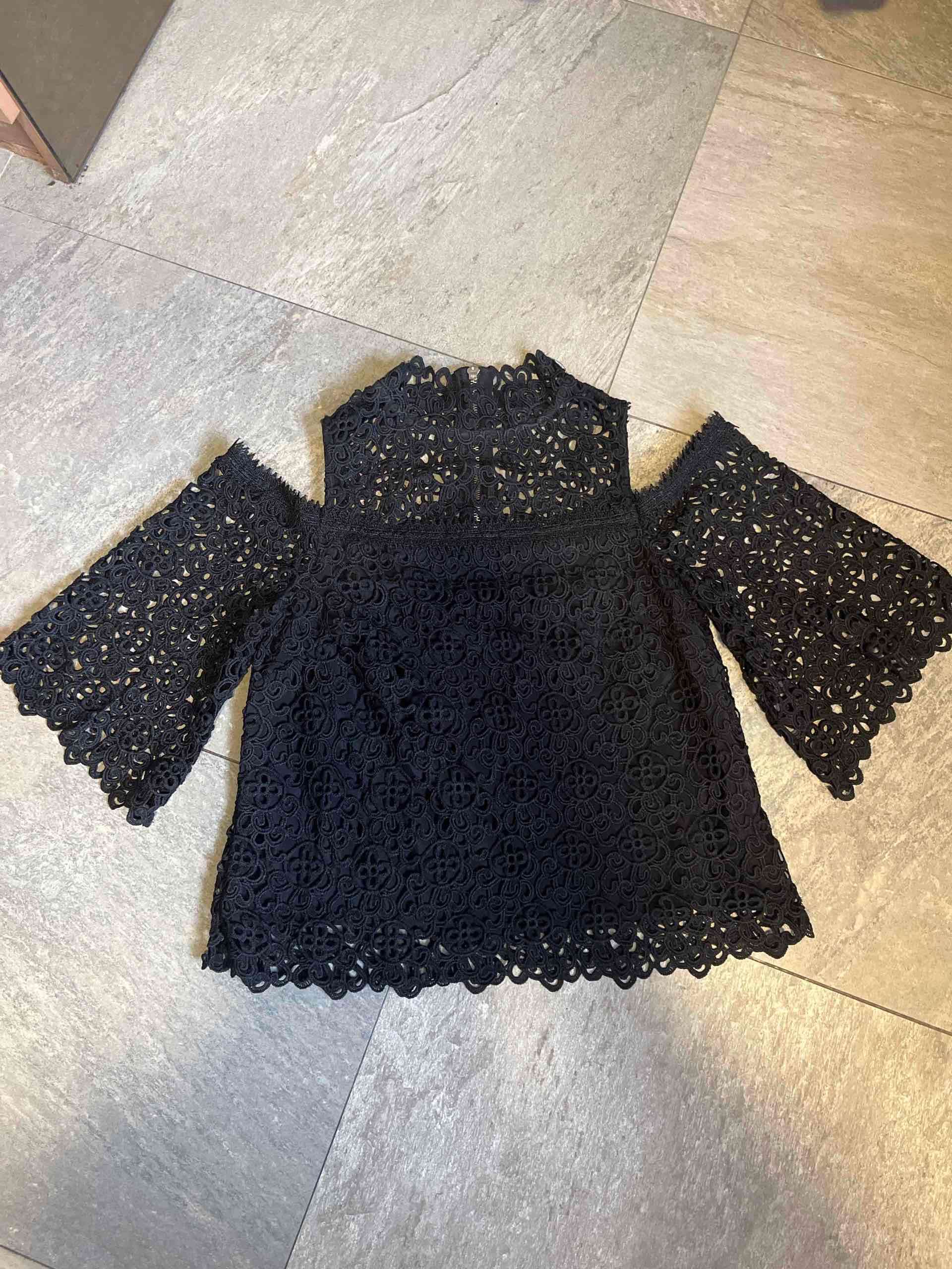 Elegante blusa de encaje negro con diseño floral. Perfecta para ocasiones especiales. En buen estado.