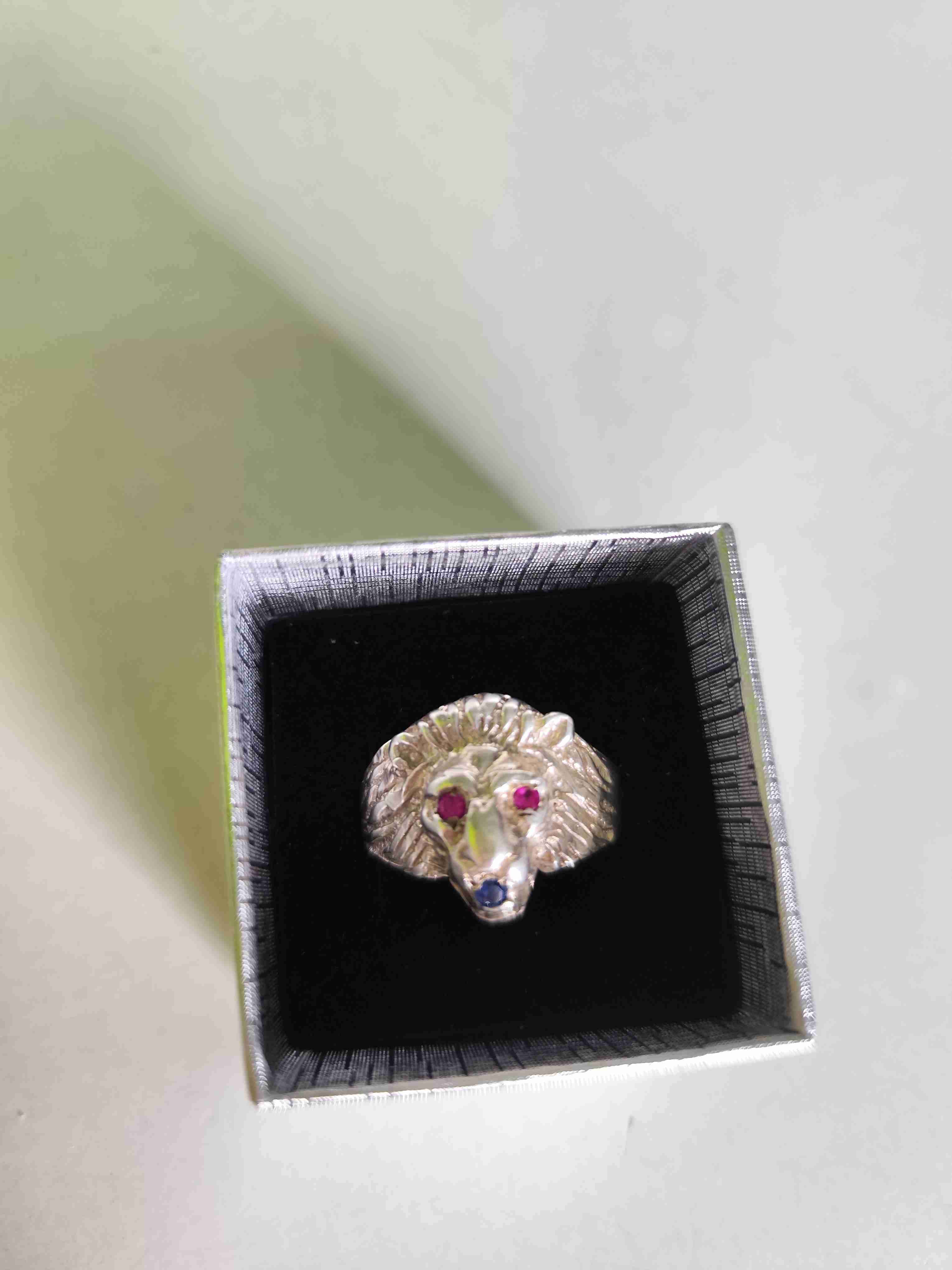 Elegante anillo con diseño de cabeza de león y piedras brillantes. Ideal para lucir en ocasiones especiales.