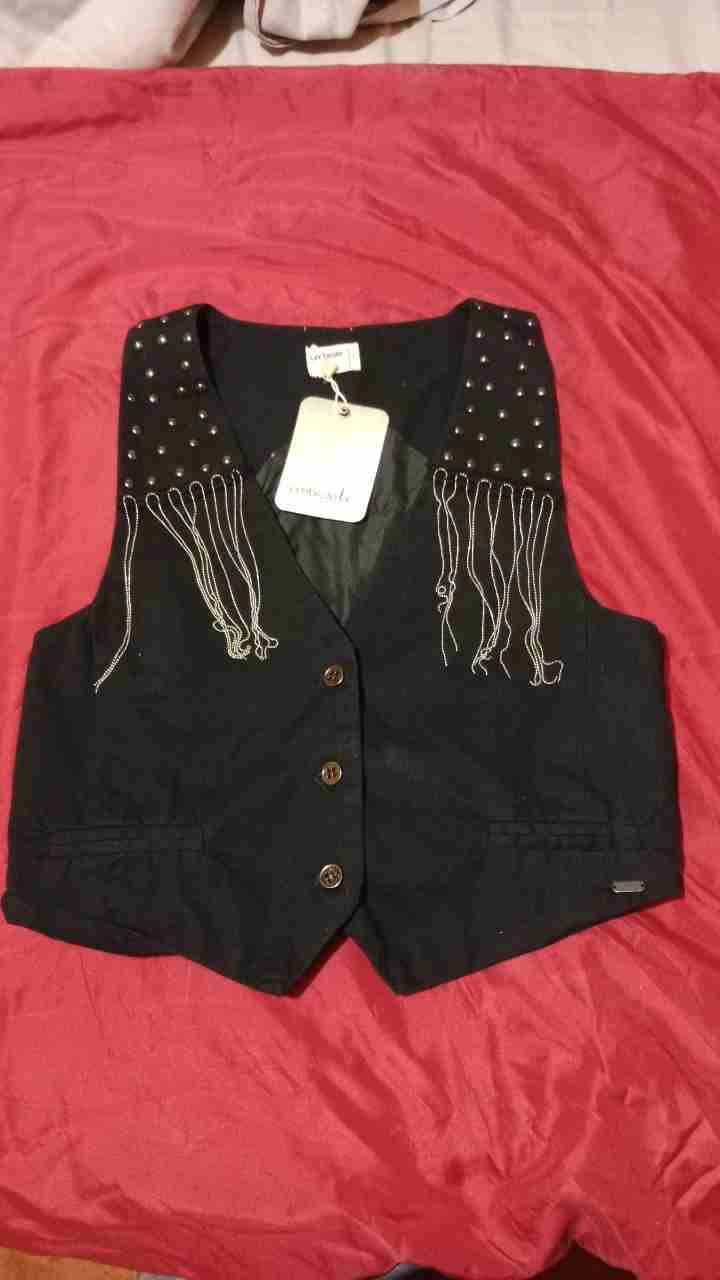 Elegante chaleco negro con flecos y detalles de tachas en los hombros. Ideal para un look casual o de fiesta. Nuevo con etiqueta.✨