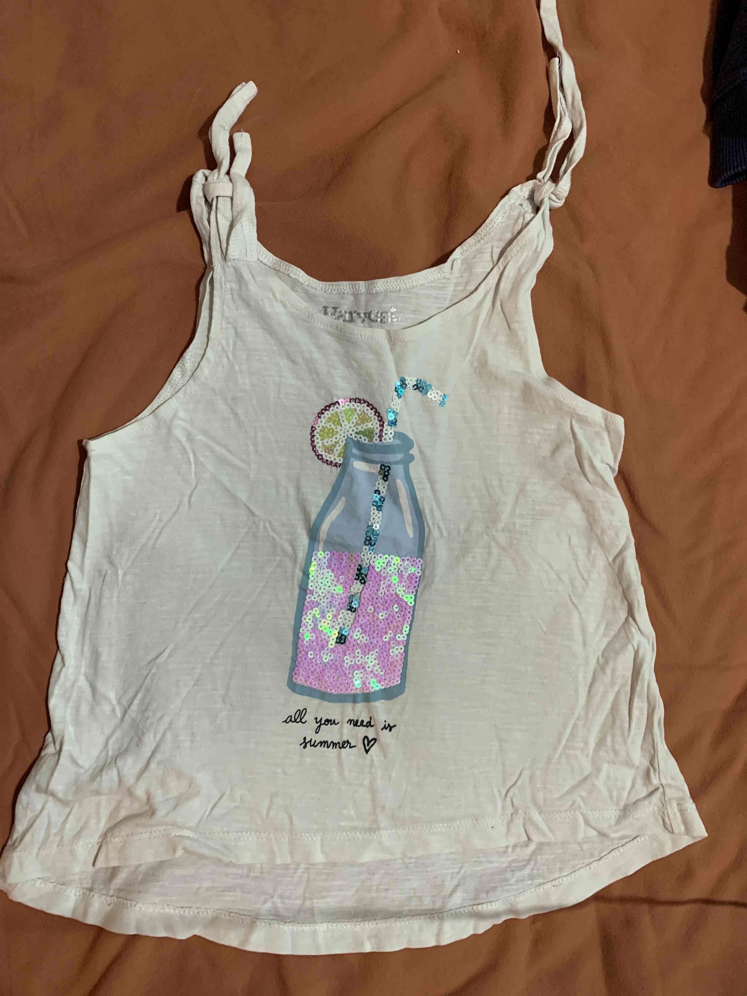 Polera sin mangas blanca con diseño de verano. Ideal para días de calor. En buen estado general. Talla 8