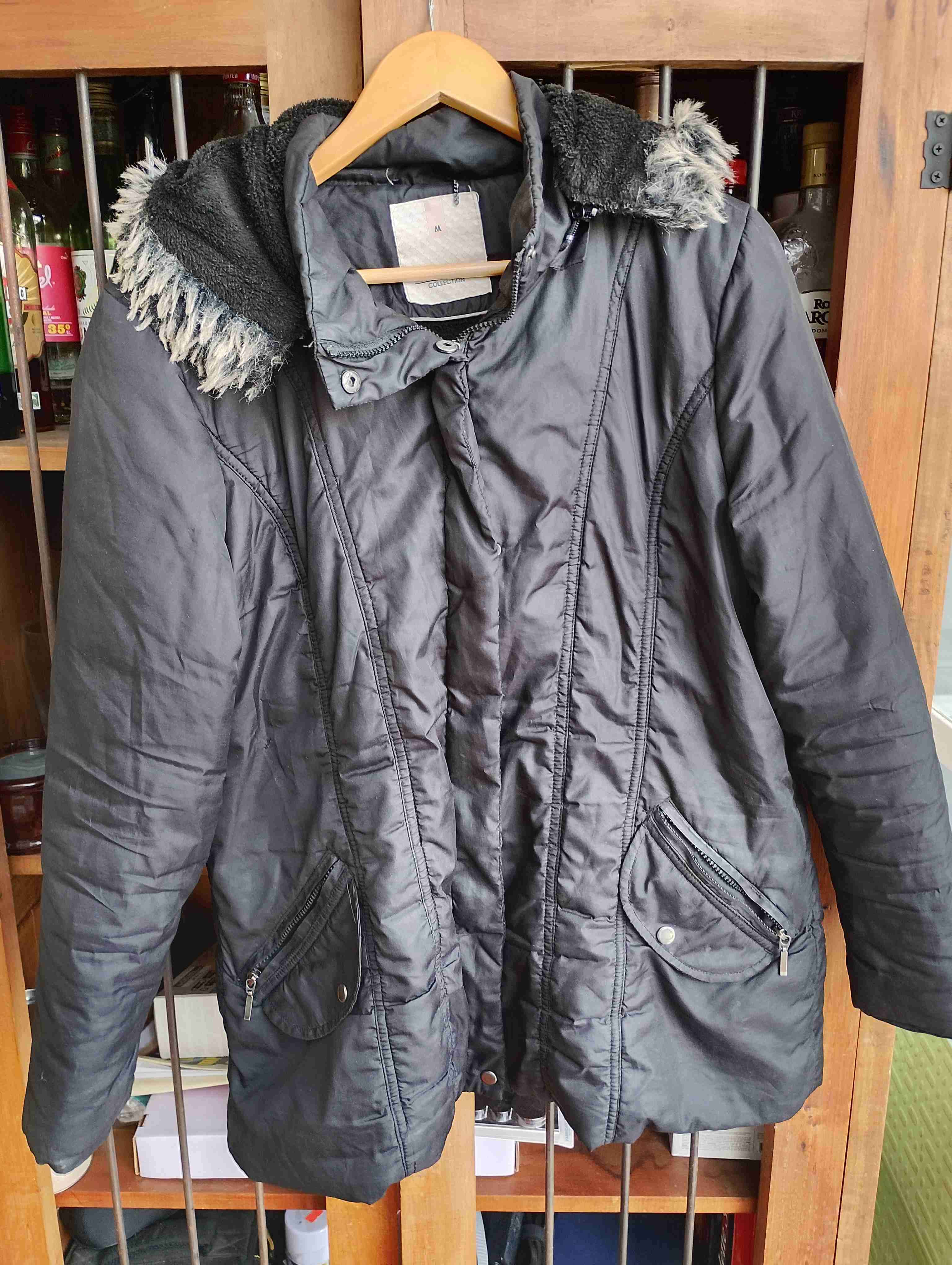 Abrigo de mujer negro, con capucha de pelo sintético. Perfecto para el invierno, en buena condición.