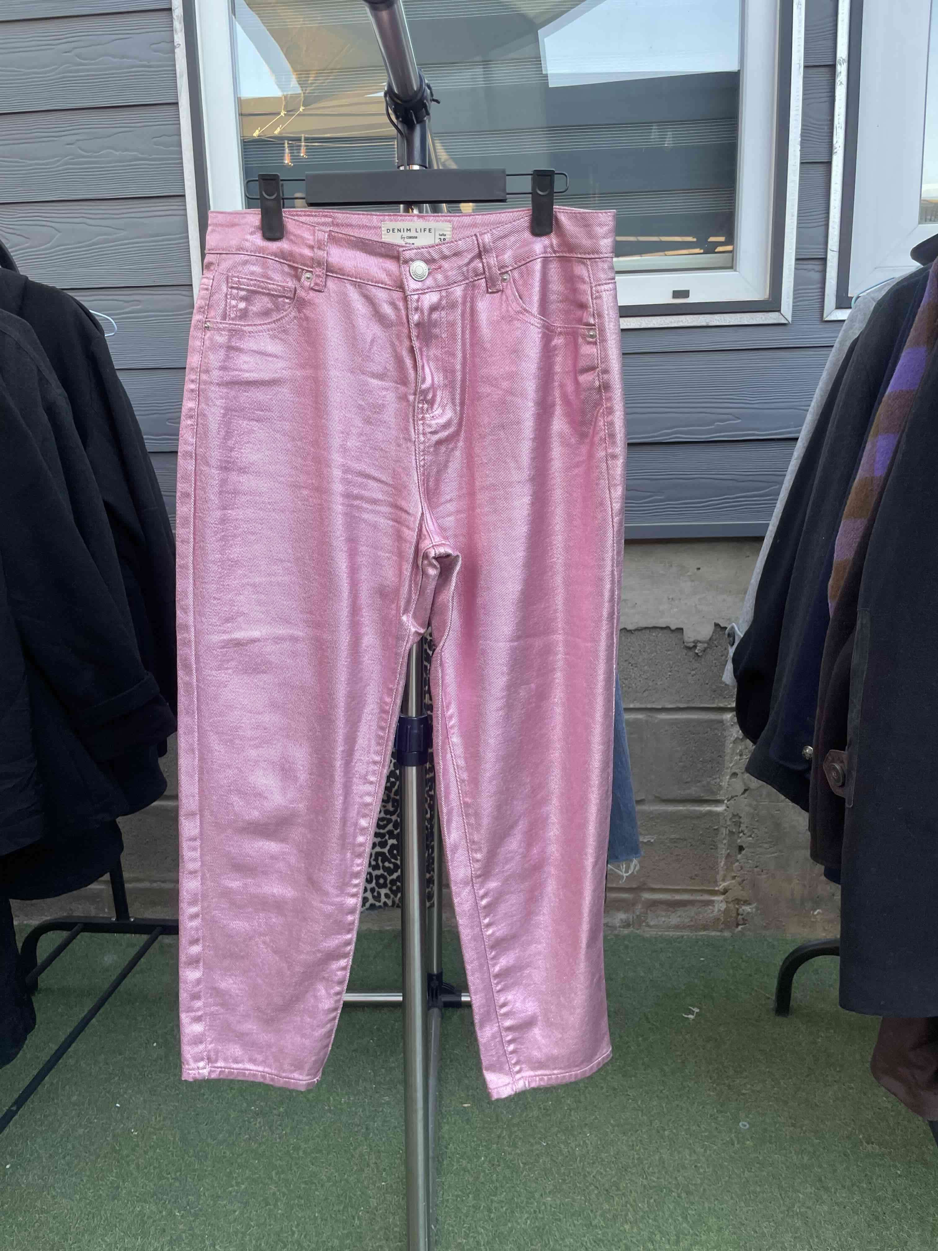 Jeans rosados con acabado metálico, estilo moderno. En buen estado, ideal para un look atrevido.