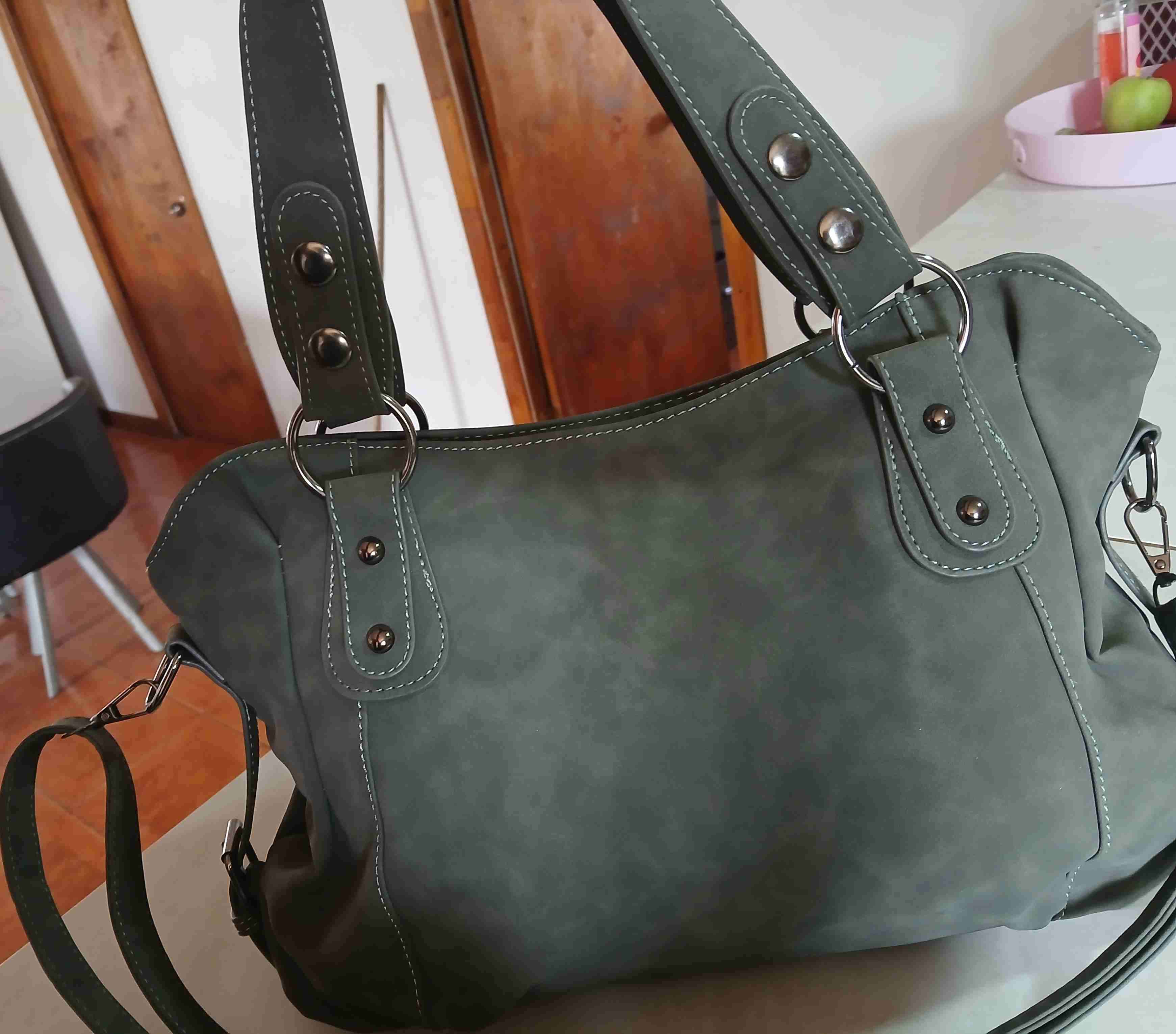 Bolso verde con correas reforzadas y detalles metálicos. Ideal para el uso diario, espacio amplio y cómodo.