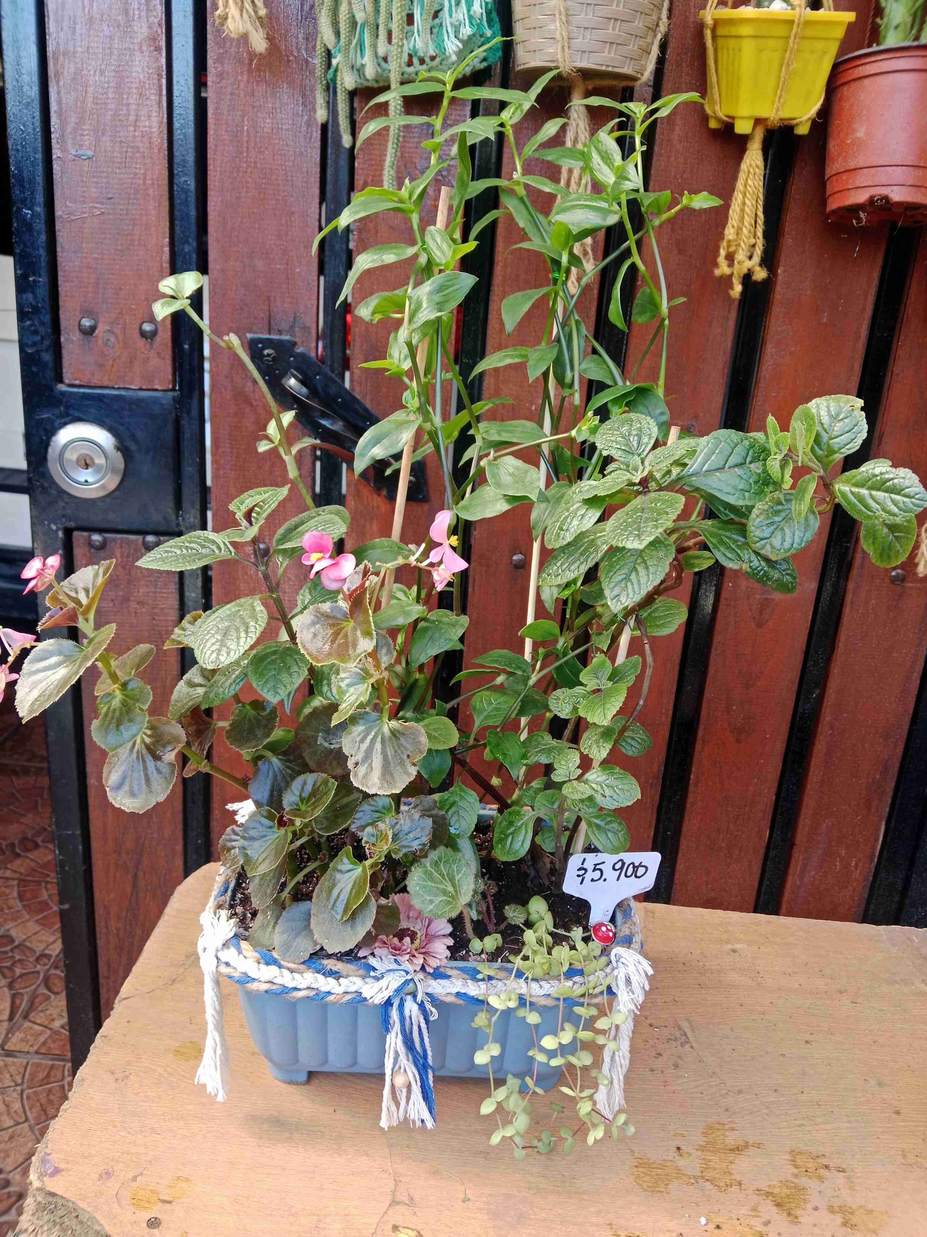 Hermoso macetero azul con variedades de plantas ornamentales. Ideal para decorar interiores o exteriores. Buen estado, ideal para amantes de la jardinería.