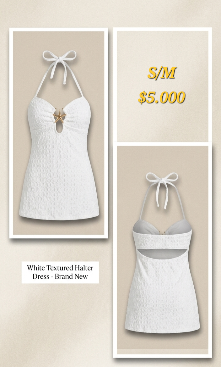 Vestido halter blanco con textura, ideal para el verano. Estado nuevo, sin usar. Falda elasticada nueva Sueters con poco uso Vestido rojo con poco uso, tela no elsticada