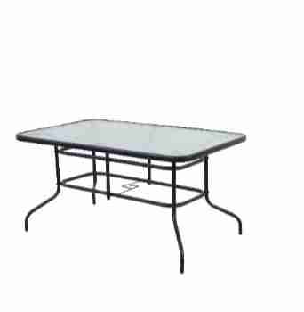 Mesa rectangular de exterior con cubierta de vidrio. Ideal para terrazas o jardines.
