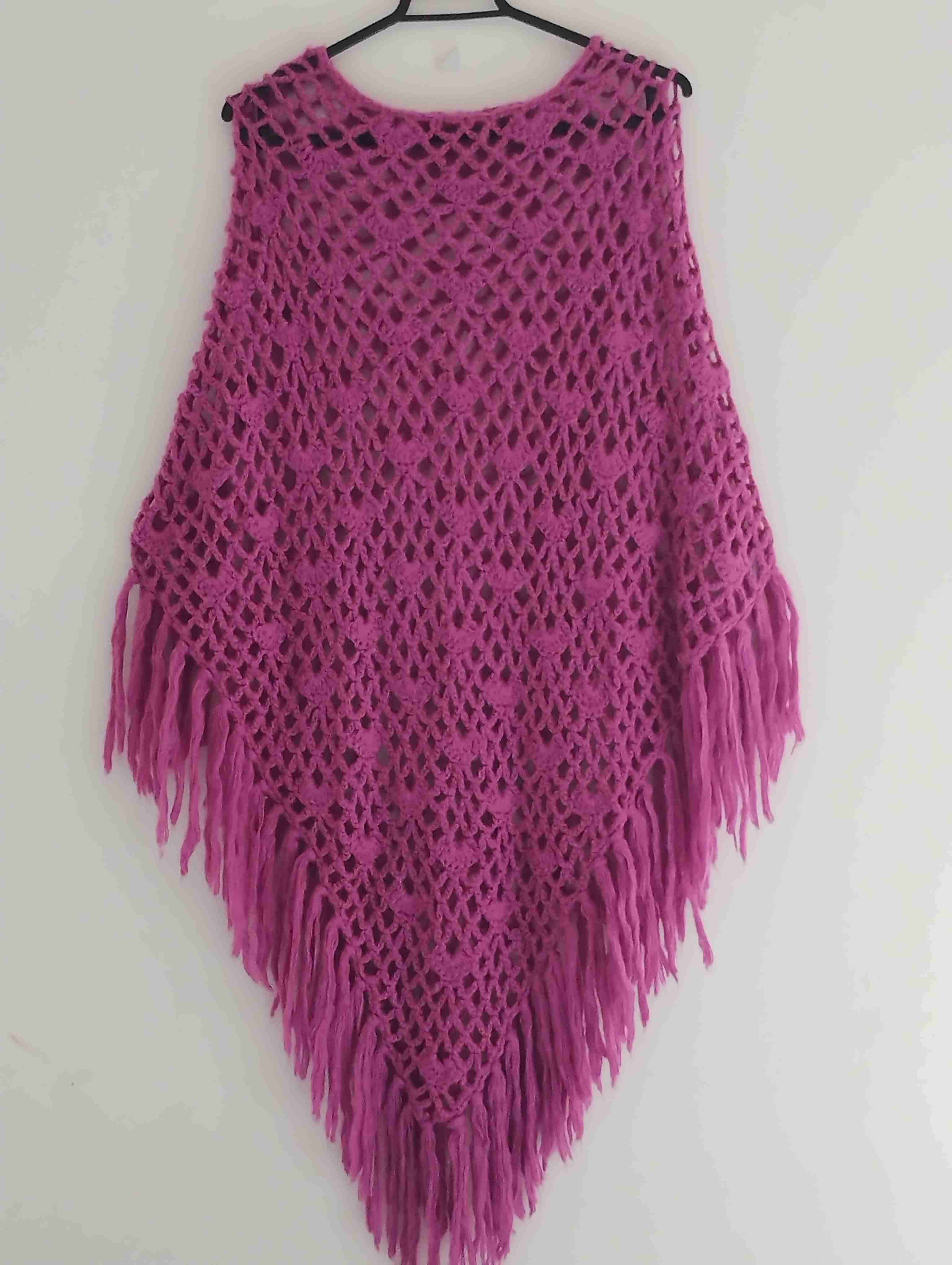 Poncho artesanal en color fucsia con flecos. Ideal para usar en otoño o invierno, en buen estado.