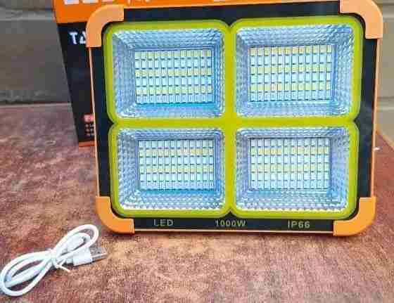 Reflector LED de alta potencia, ideal para exteriores. Resistente al agua y polvo, en buen estado. También sirve para recargar celulares y cuenta con 4 modos de iluminación Es solar y eléctrico