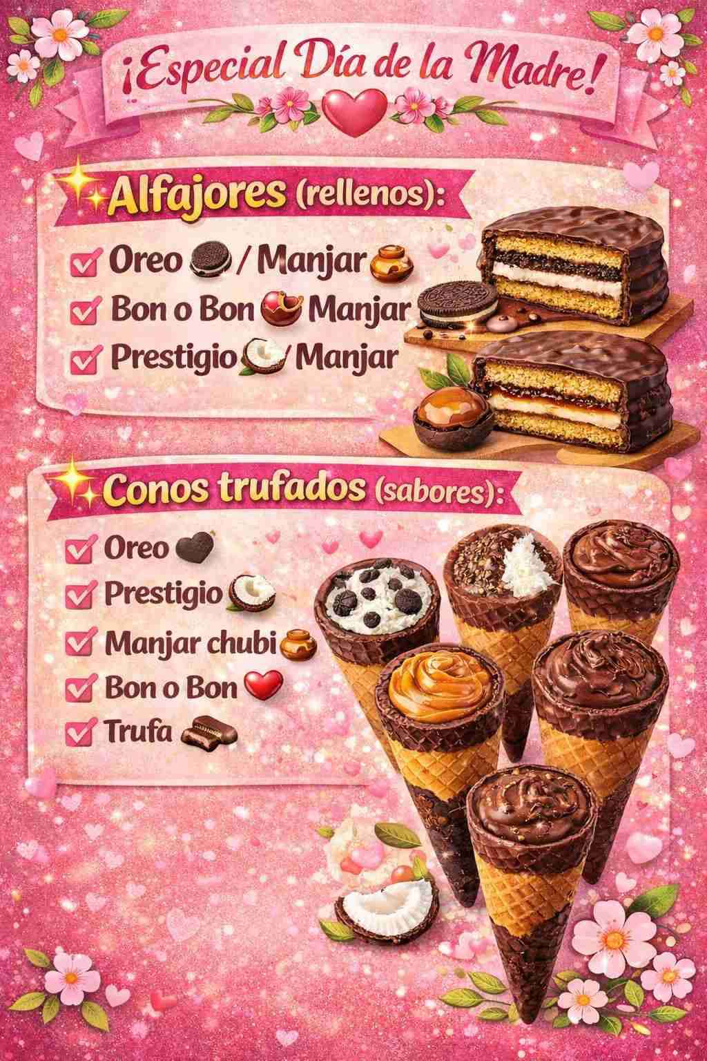 Delicioso pack de alfajores rellenos y conos trufados, ideal para regalar en el Día de la Madre. Desde los 5 mil pesitos. Variedad de sabores como Oreo y Manjar. Perfecto para disfrutar en familia. Encarga el tuyo pronto!!
