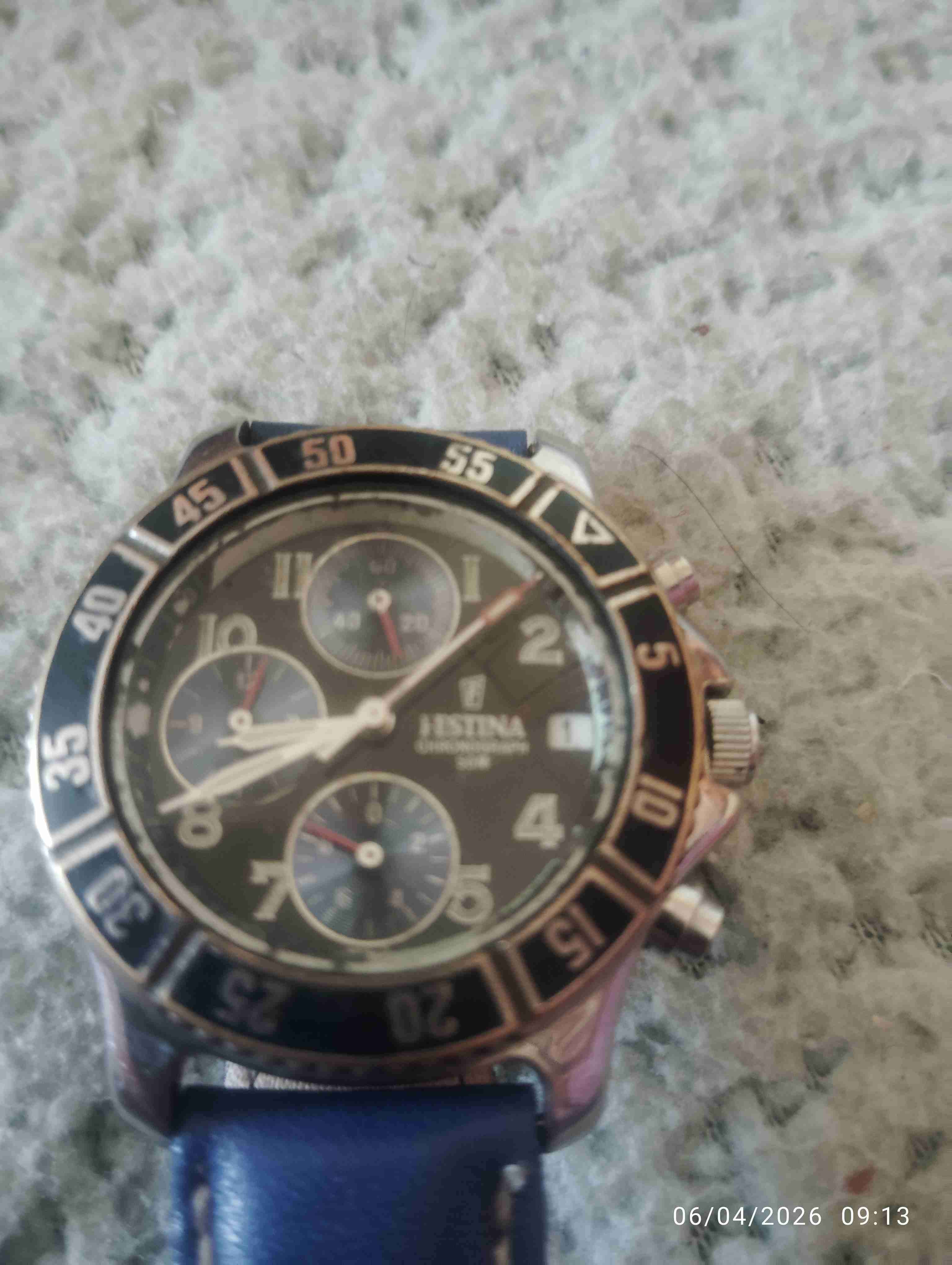Reloj de pulsera cronógrafo con correa azul, estilo deportivo. En buen estado general, ideal para uso diario.