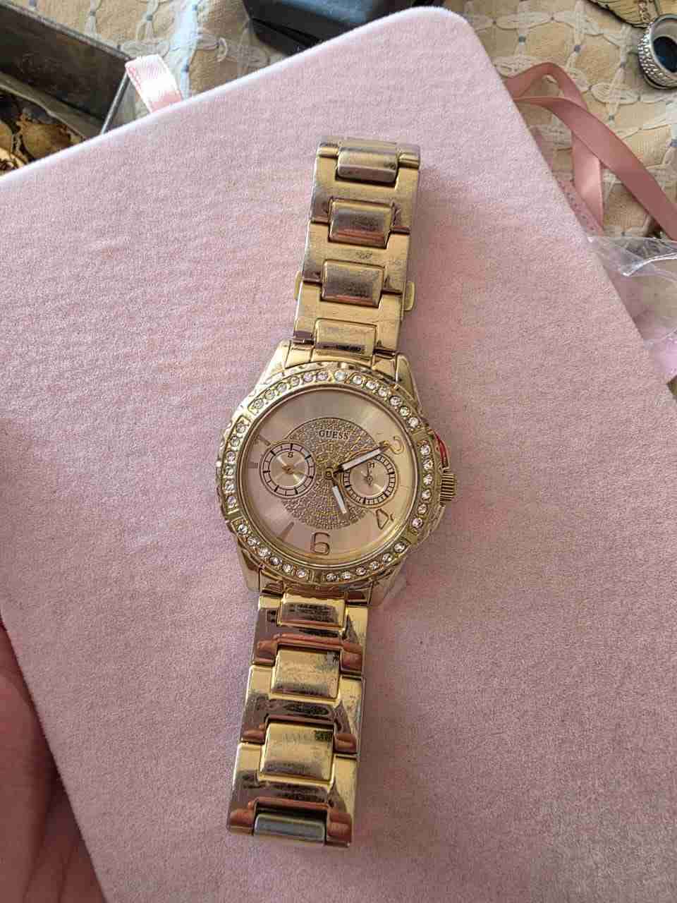 Elegante reloj Guess dorado con cristales decorativos. En buen estado, funcionando, ideal para ocasiones especiales. Detalles desgaste en pulsera, visibles en foto. Vendo por apuro.