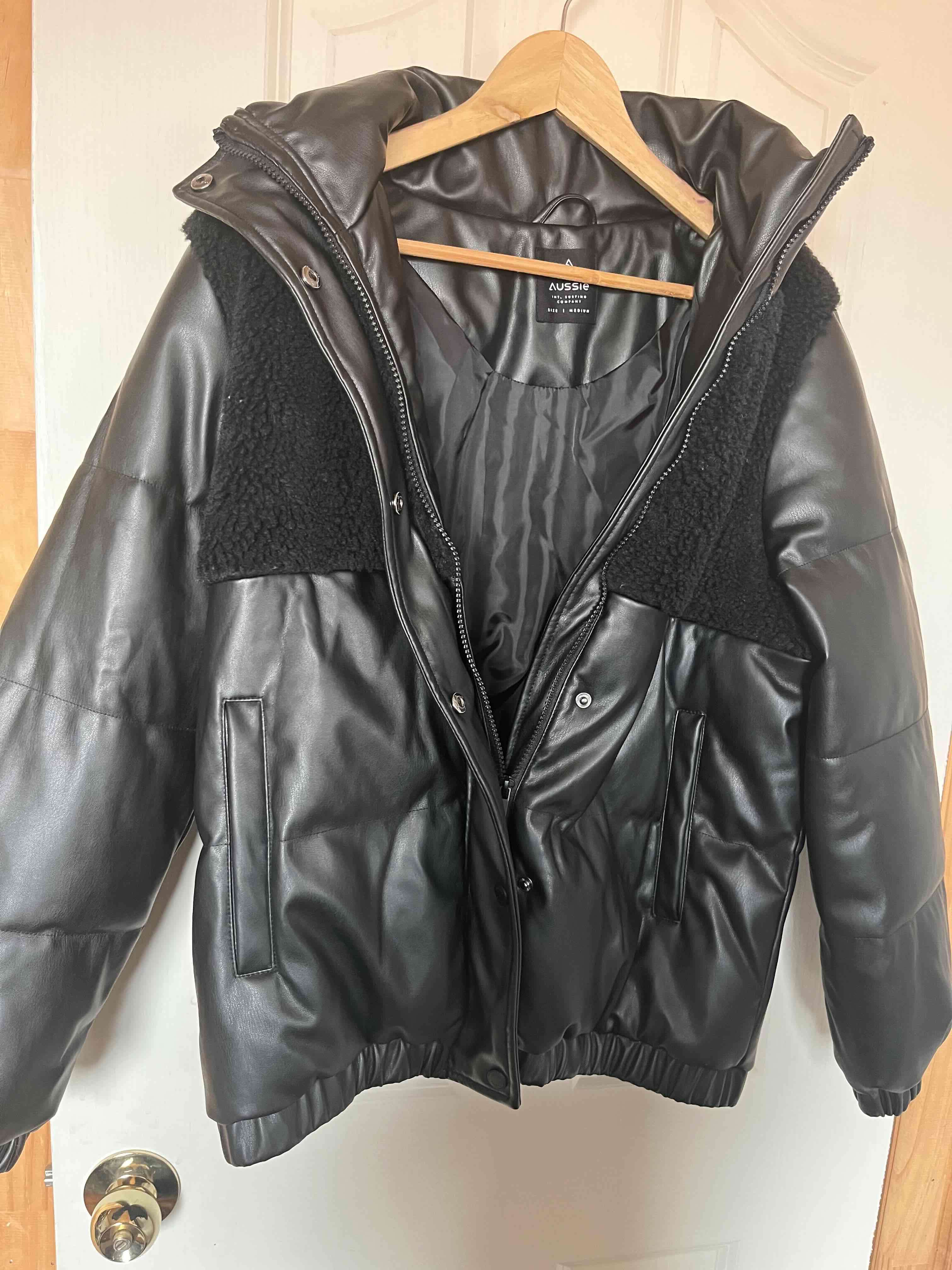 Chaqueta acolchada de cuero sintético negro, ideal para invierno. Mantiene el calor y tiene diseño moderno.