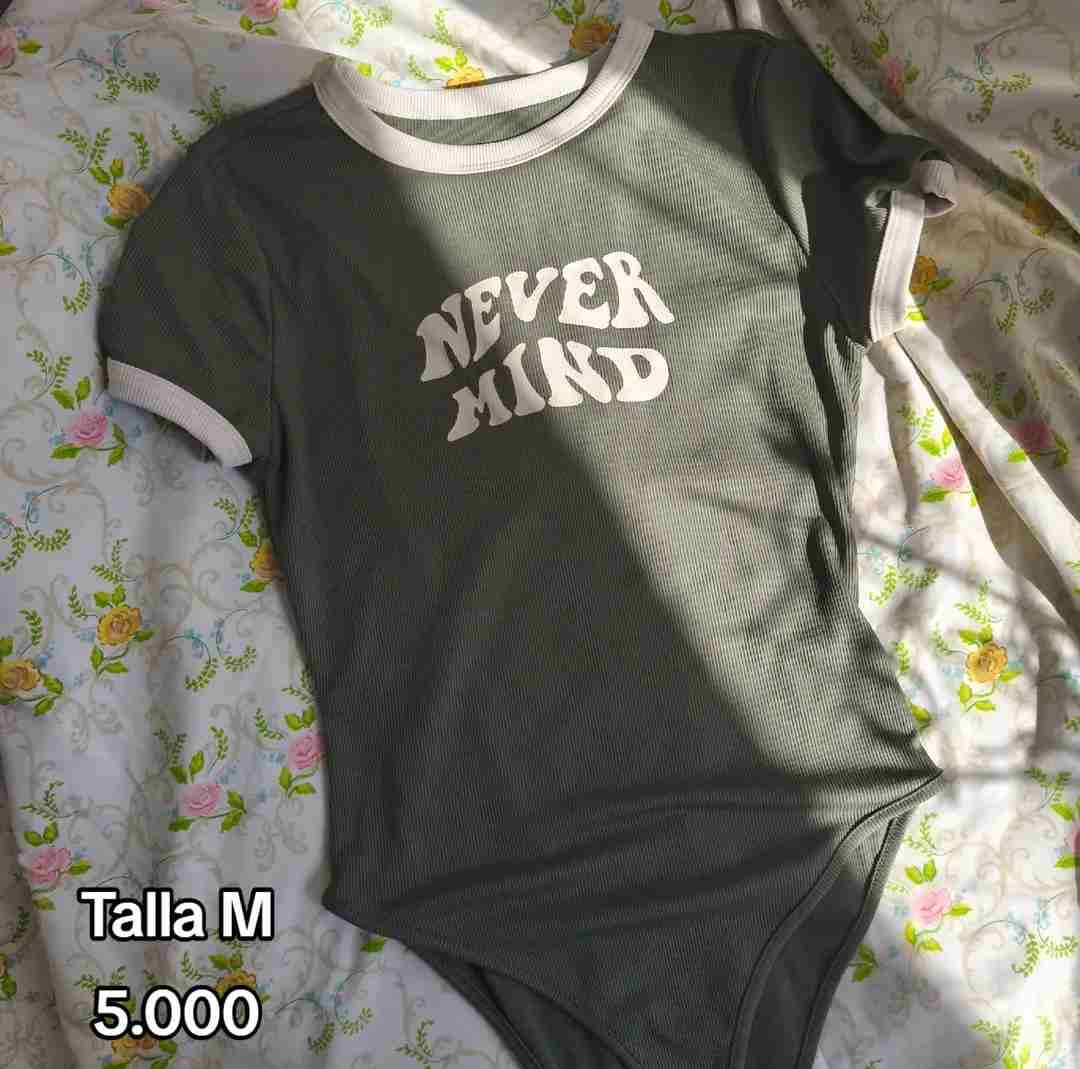 Body verde talla M, estilo casual con texto 'Never Mind'. En buen estado, ideal para looks relajados.