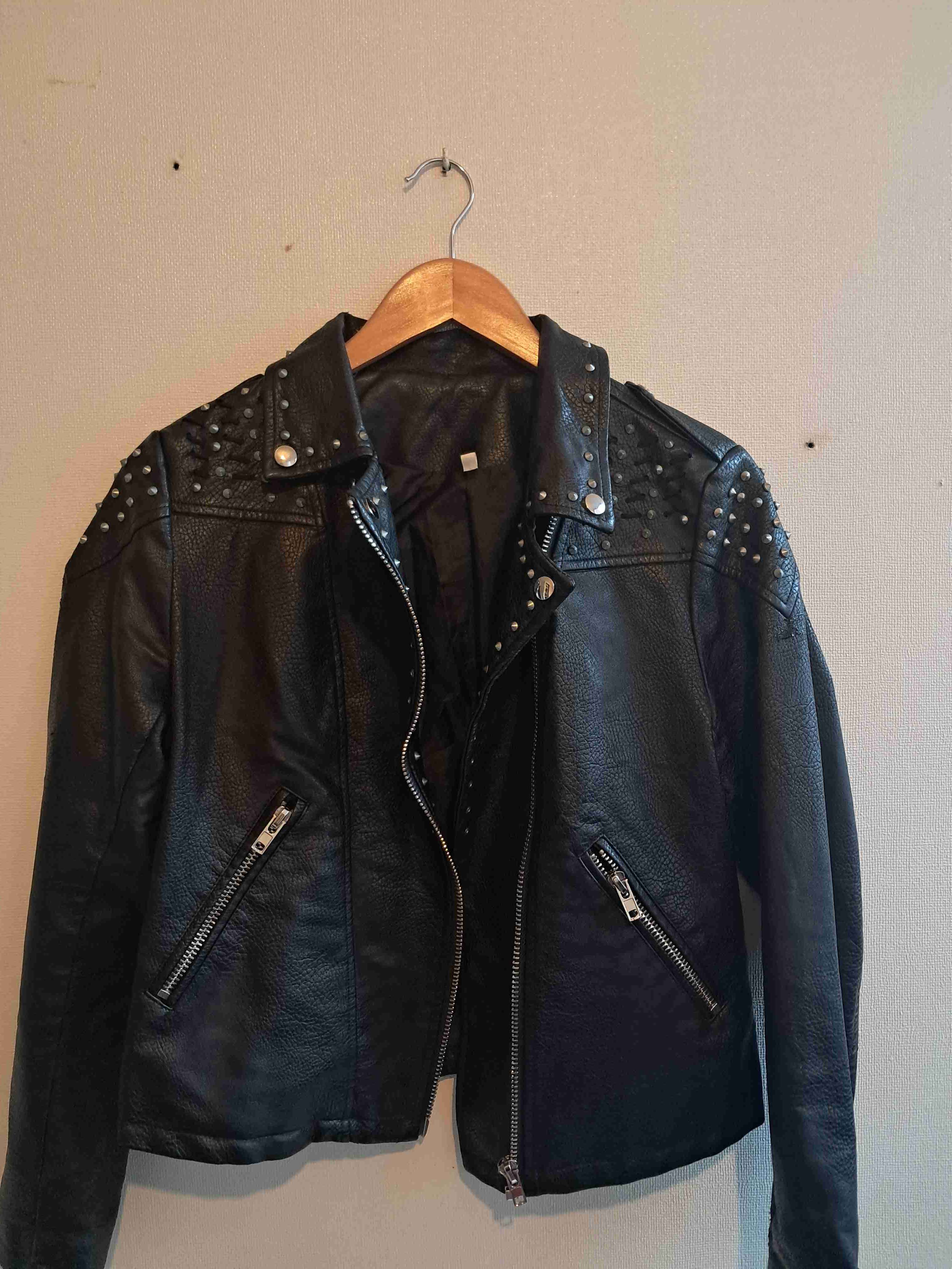 Elegante chaqueta de cuero negro con detalles de tachas en los hombros. Ideal para ocasiones casuales o nocturnas. En buen estado general. Detalles en las últimas fotos.