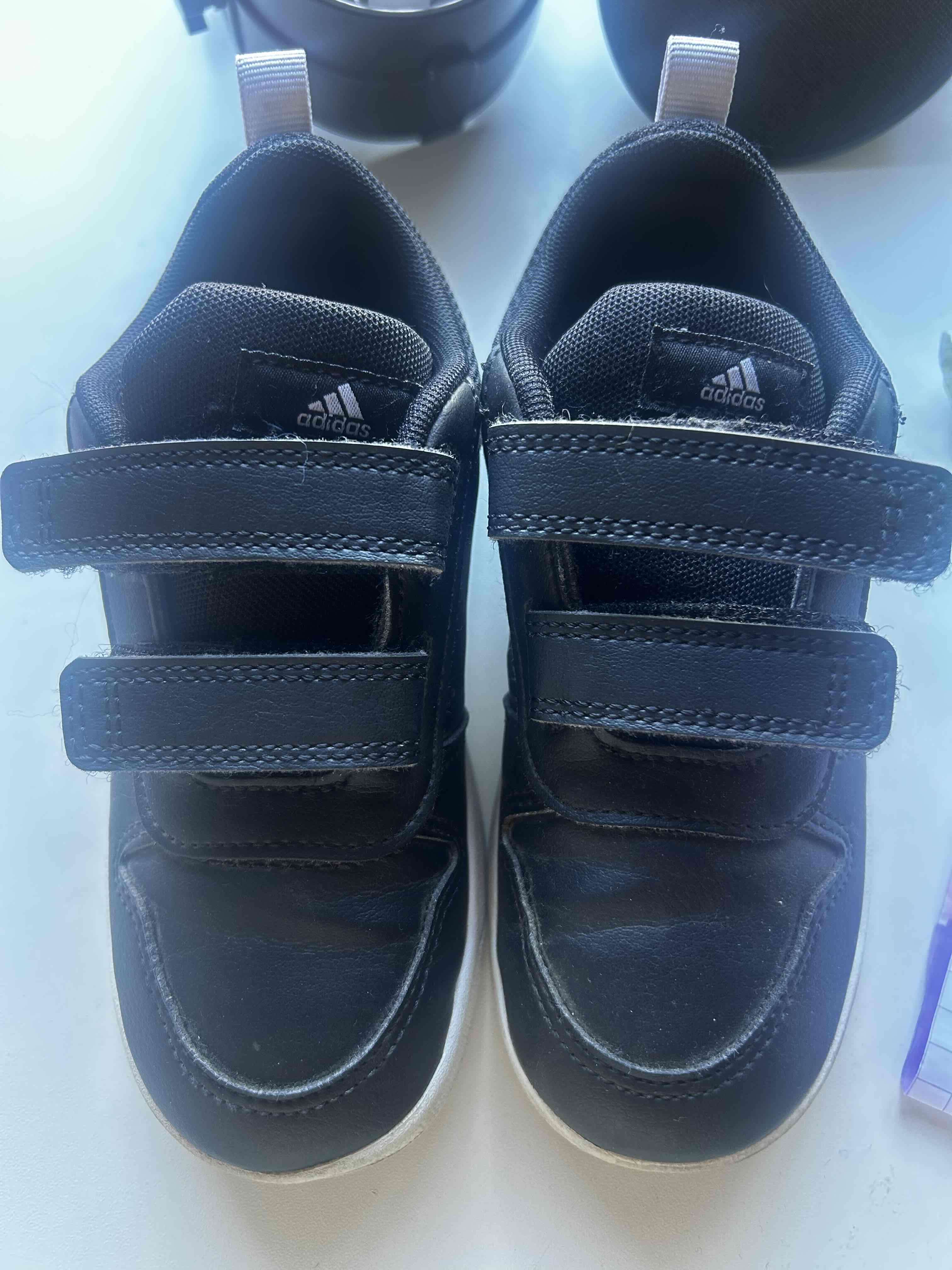 Zapatillas Adidas negras para niño con cierre de velcro. Prácticamente nuevas , ideales para el colegio o salidas casuales.talla 27 , 16 cms