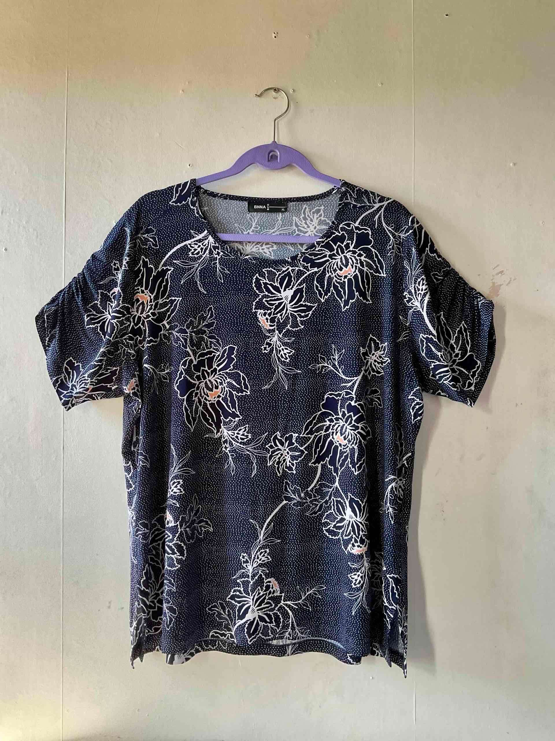 Polera suelta de color azul marino con diseño floral blanco, ideal para un look casual. En buen estado, con leves signos de uso.