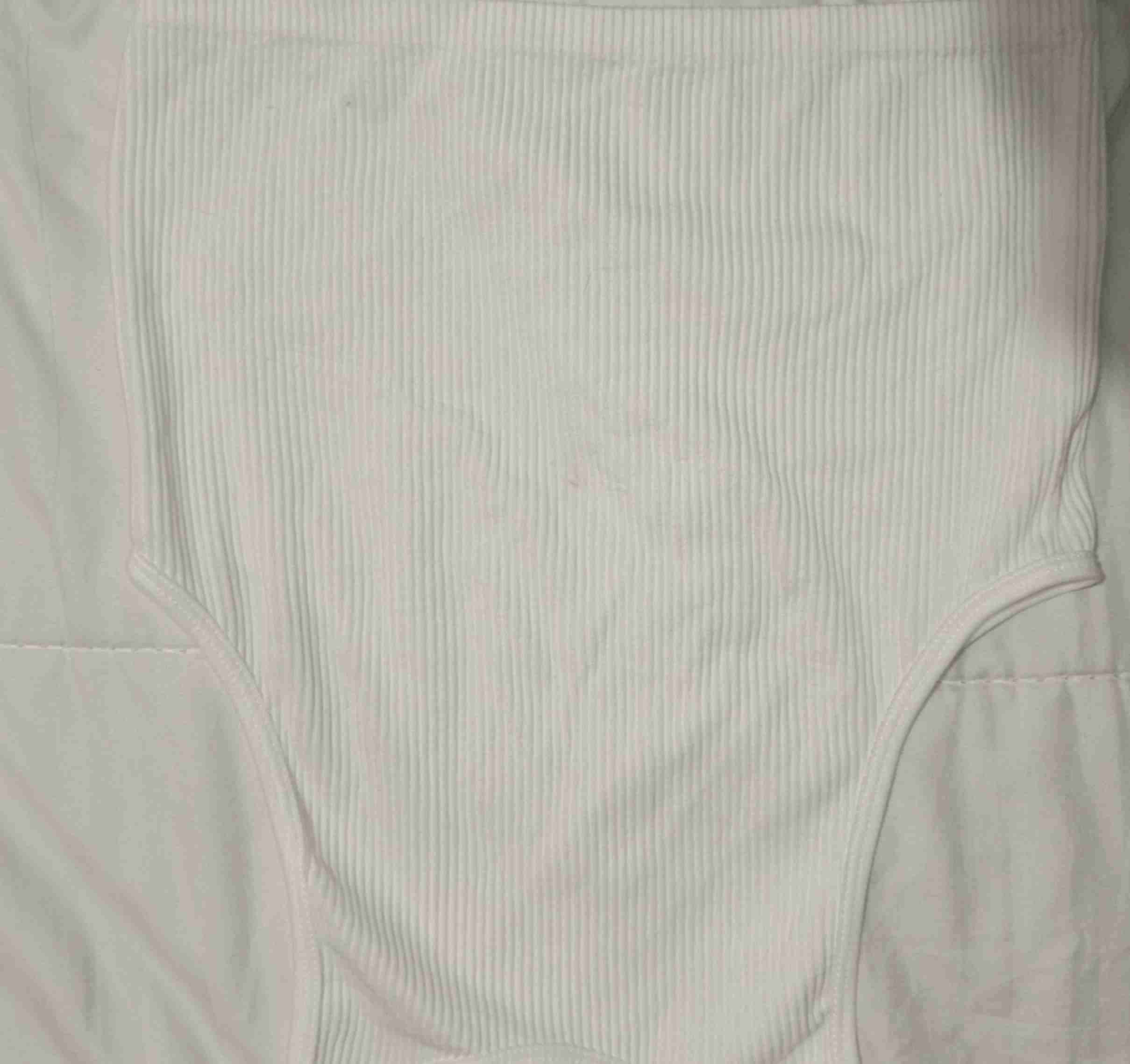 Top blanco de estilo acanalado, ideal para uso diario. En buen estado general, con ligeras marcas de uso. Talla standar. Se trasluce el sostén
